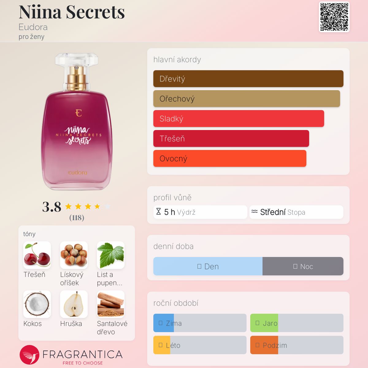 Niina Secrets podle Eudora je Orientální Floral vůně pro ženy. Niina Secrets byl/a uveden/a v roce 2021. "Nosem" za touto vůní je Christelle Laprade. Vrchní tóny jsou Třešeň, Černý rybíz, Hruška, Pistácie a Mandarinka; střední tóny jsouJasmín Sambac, Magnólie, Konvalinka, Fialka a Levandule ; základní tóny jsou Lískový oříšek, Kokos, Santalové dřevo, Pižmo a Cedr.