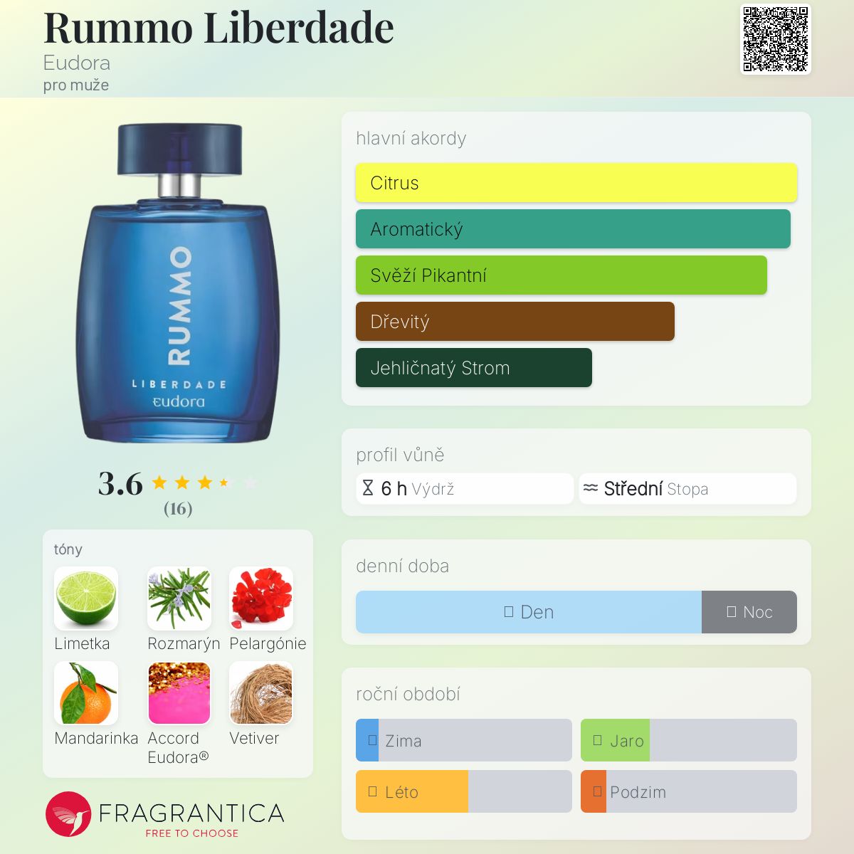 Rummo Liberdade podle Eudora je Aromatic Fougere vůně pro muže. Rummo Liberdade byl/a uveden/a v roce 2019. Vrchní tóny jsou Limetka a Mandarinka; střední tóny jsouRozmarýn a Pelargónie ; základní tóny jsou Accord Eudora®, Vetiver a Cedr.