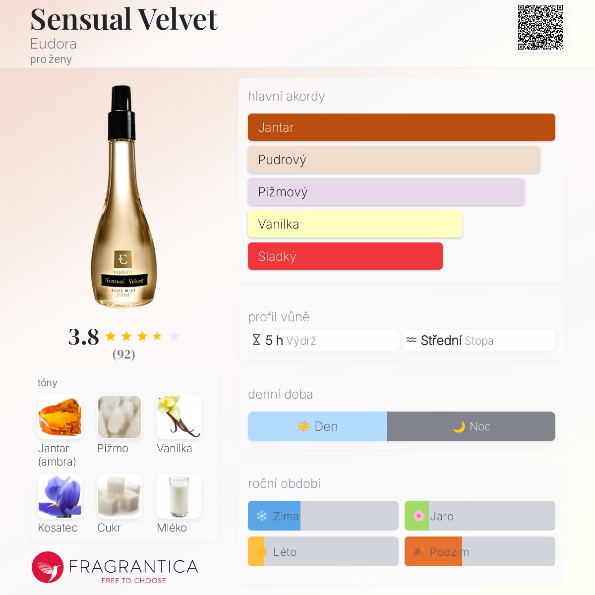 Sensual Velvet podle Eudora je Orientální vůně pro ženy. Sensual Velvet byl/a uveden/a v roce 2013. Vrchní tóny jsou Černý rybíz, Bergamot, Jablko a Brazilské růžové dřevo; střední tóny jsouKosatec, Mléko, Jasmín a Otočník ; základní tóny jsou Jantar (ambra), Pižmo, Vanilka, Cukr, Accord Eudora® a Pačuli.
