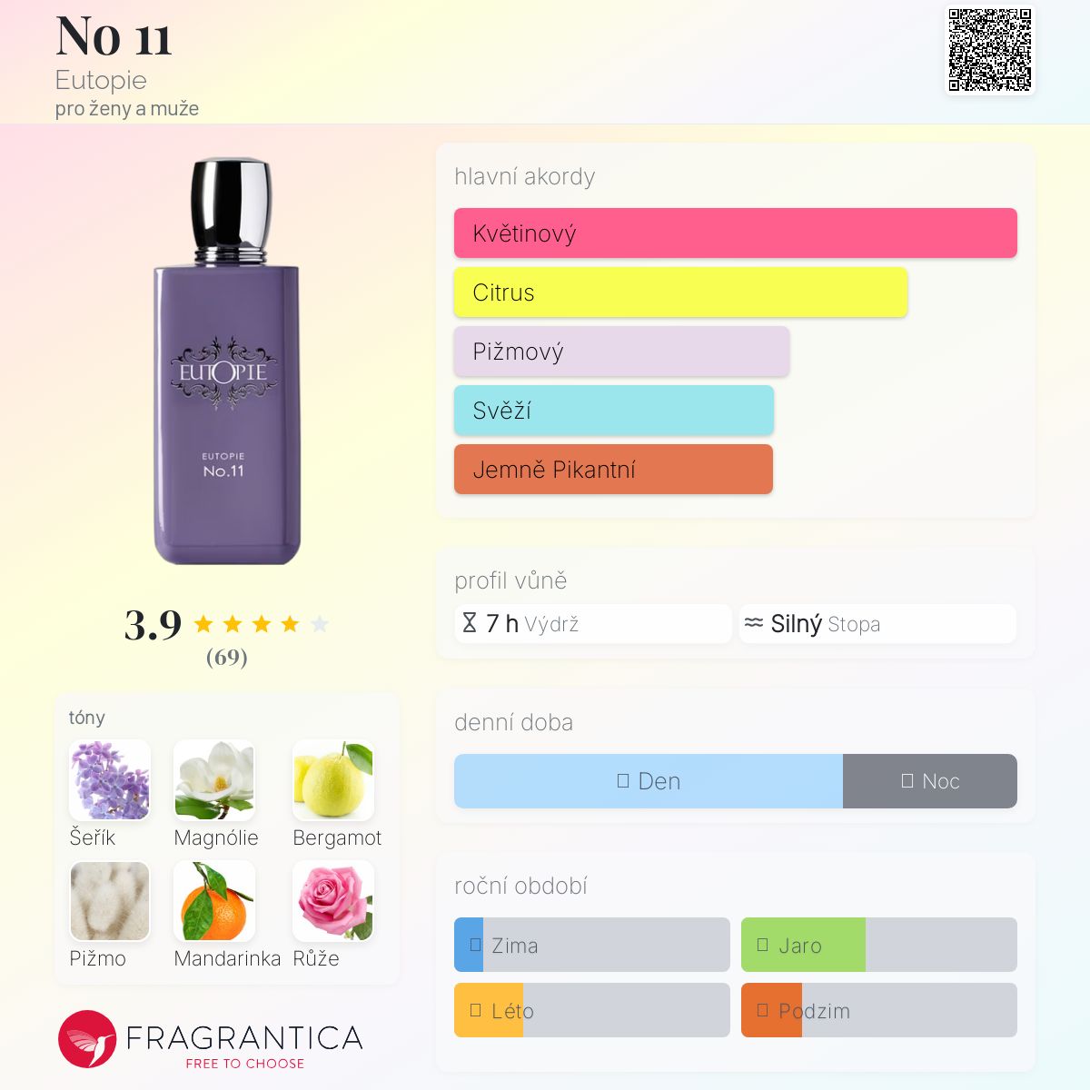 No 11 podle Eutopie je Floral Woody Musk vůně pro ženy a muže. No 11 byl/a uveden/a v roce 2018. "Nosem" za touto vůní je Nanako Ogi. Vrchní tóny jsou Bergamot, Žlutá mandarinka a Růžový pepř; střední tóny jsouŠeřík, Magnólie a Růže ; základní tóny jsou Pižmo, Cedr a Jantar (ambra).