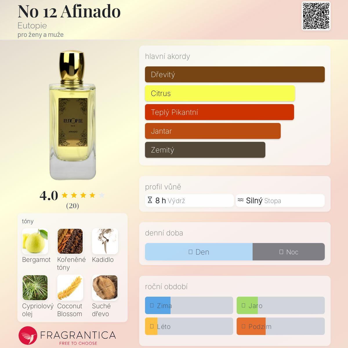 No 12 Afinado podle Eutopie je Chypre Fruity vůně pro ženy a muže. No 12 Afinado byl/a uveden/a v roce 2023. "Nosem" za touto vůní je Nathalie Templer. Vrchní tóny jsou Bergamot, Kokosový květ a Ovocné tóny; střední tóny jsouKoření, Kadidlo a Pačuli ; základní tóny jsou Cypriolový olej, Suché dřevo a Bílý jantar (ambra).