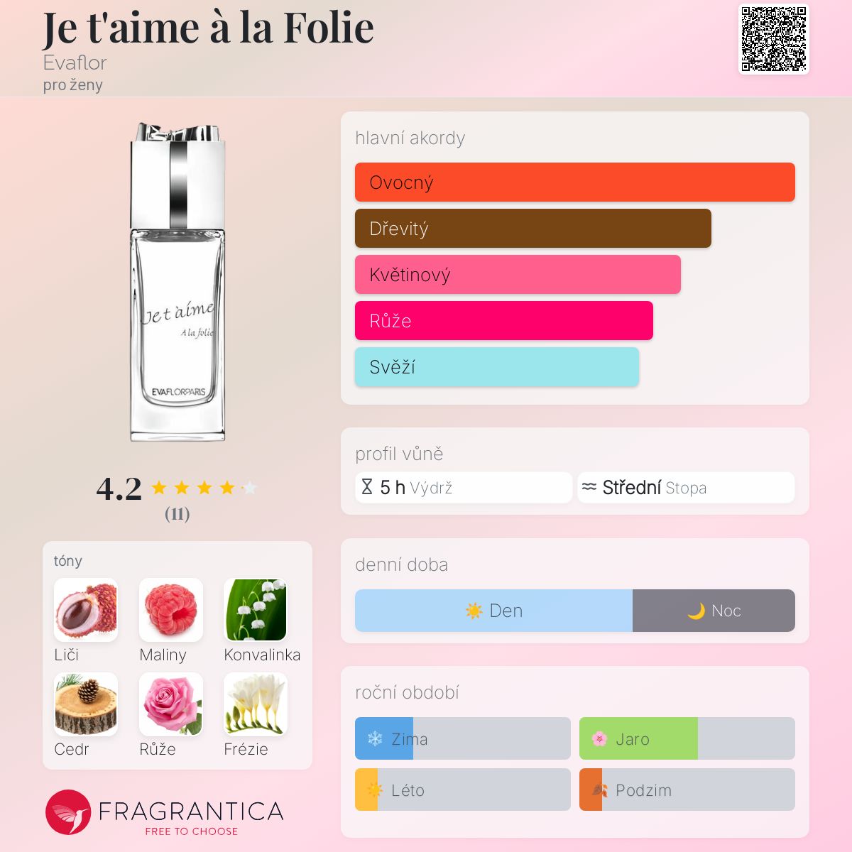 Je t'aime à la Folie podle Evaflor je Floral Fruity vůně pro ženy. Vrchní tóny jsou Liči, Maliny a Černý rybíz; střední tóny jsouKonvalinka, Růže a Frézie ; základní tóny jsou Cedr, Pižmo, Jantar (ambra), Pačuli a Vetiver.