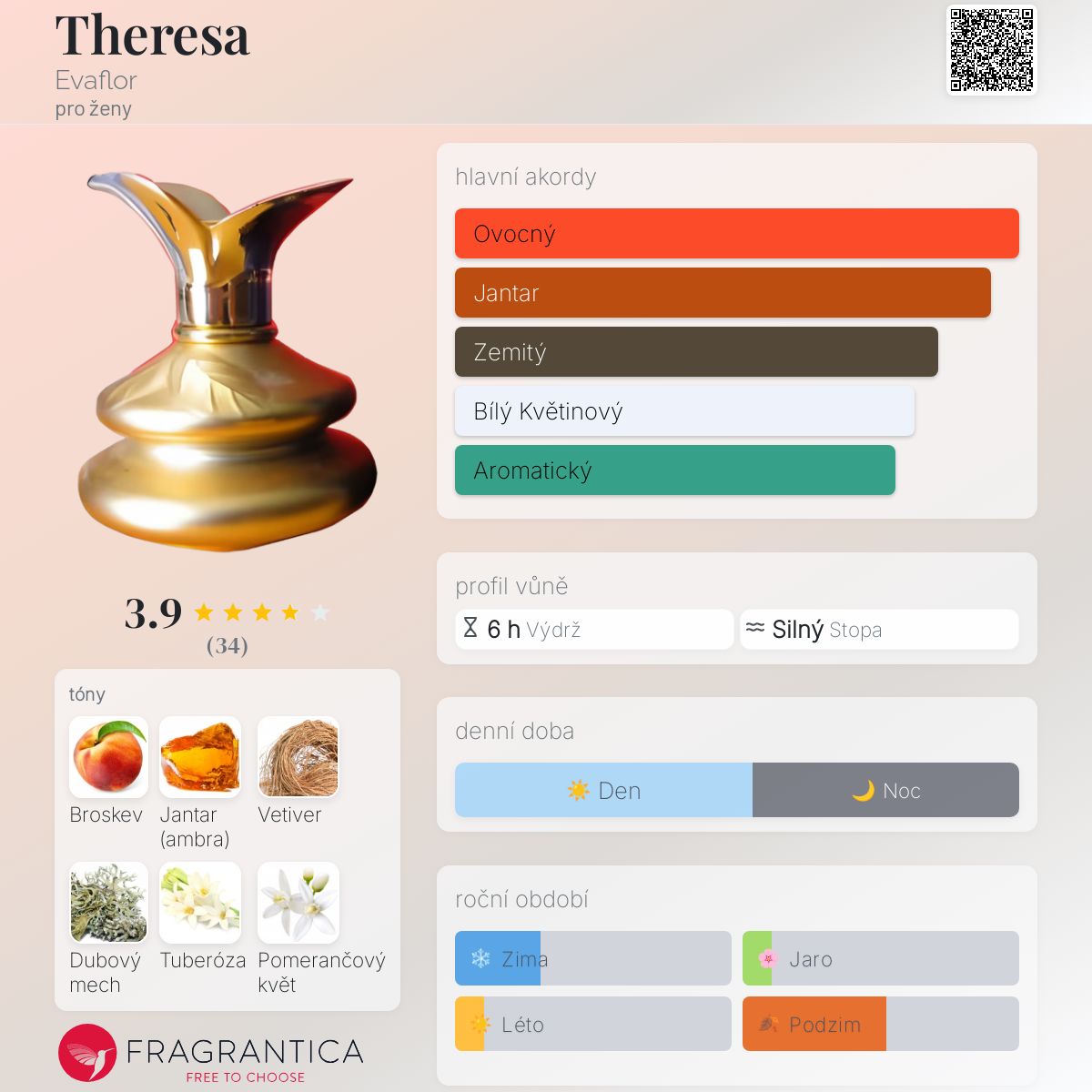 Theresa podle Evaflor je Orientální Floral vůně pro ženy. Theresa byl/a uveden/a v roce 2011. Vrchní tóny jsou Pomerančový květ, Bergamot a Mandarinka; střední tóny jsouBroskev, Tuberóza, Švestka a Kosatec ; základní tóny jsou Jantar (ambra), Vetiver, Dubový mech a Pačuli.