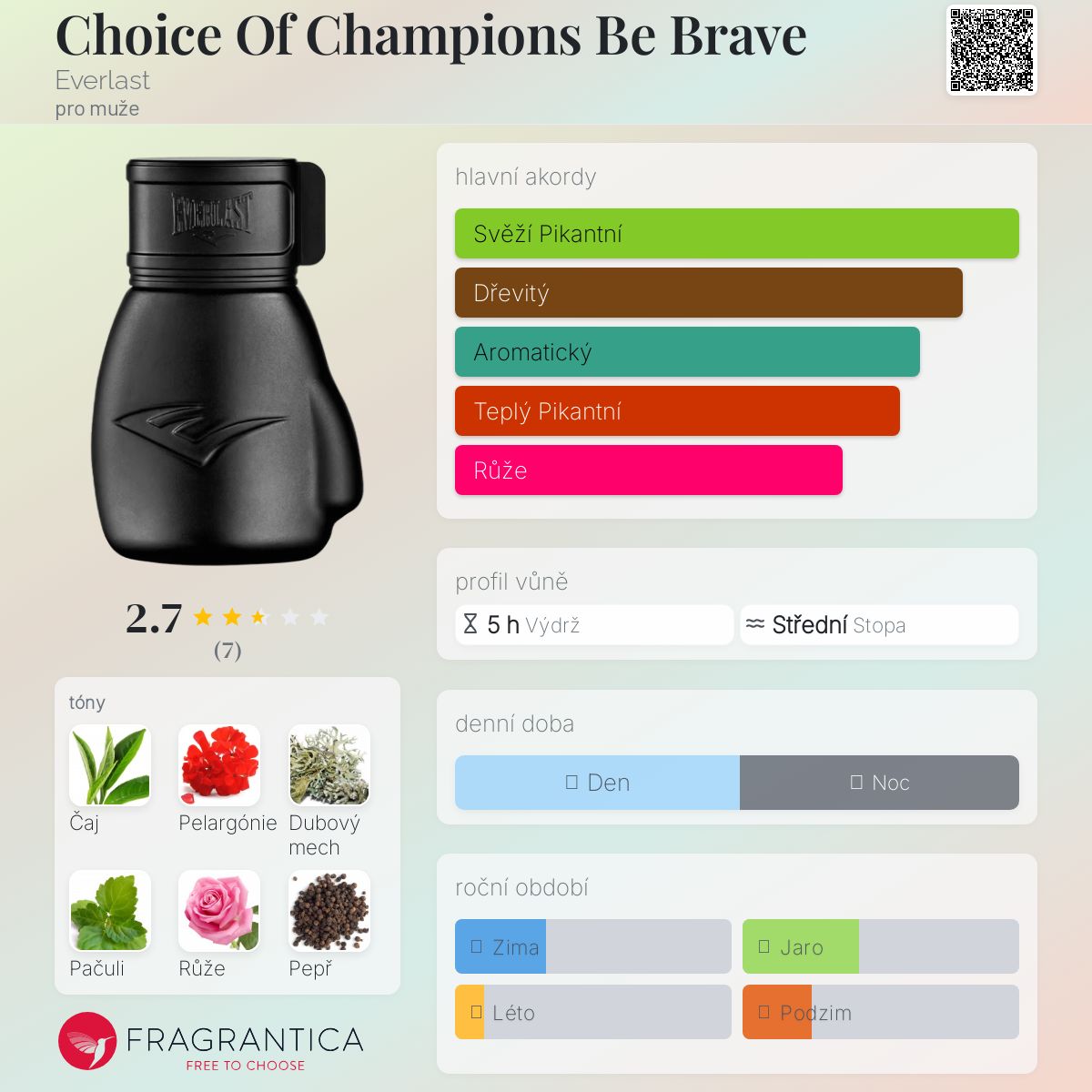 Choice Of Champions Be Brave podle Everlast je Aromatic vůně pro muže. Choice Of Champions Be Brave byl/a uveden/a v roce 2020. Vrchní tóny jsou Růže, Levandule, Jalovec, Zázvor, Bergamot a Pomeranč; střední tóny jsouČerný čaj, Pelargónie, Černý pepř a Magnólie ; základní tóny jsou Dubový mech, Pačuli, Santalové dřevo, Jantar (ambra) a Cedr.