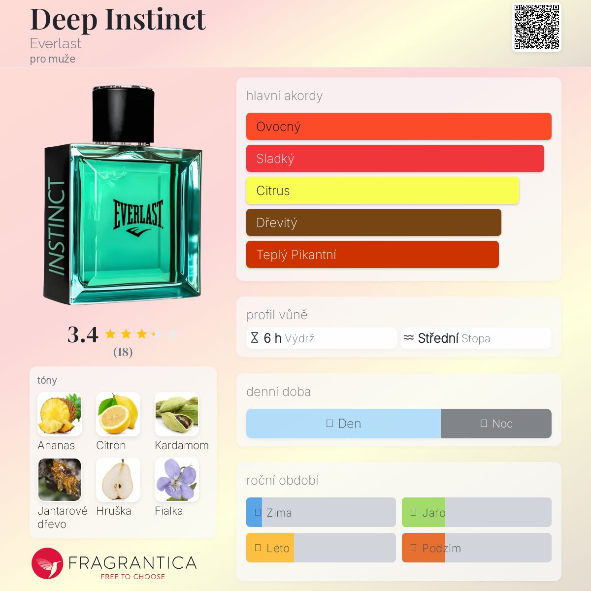 Deep Instinct podle Everlast je Orientální vůně pro muže. Deep Instinct byl/a uveden/a v roce 2017. "Nosem" za touto vůní je Benjamin Belizon. Vrchní tóny jsou Ananas, Sicilský citron a Hruška; střední tóny jsouKardamom, Fialka a Pomerančový květ ; základní tóny jsou Jantarové dřevo, Pižmo a Kašmírové dřevo.