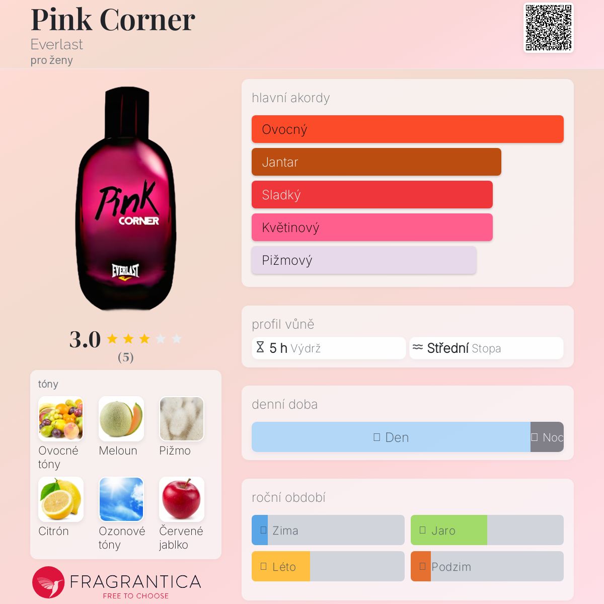 Pink Corner podle Everlast je Floral Fruity vůně pro ženy. Vrchní tóny jsou Ovocné tóny, Meloun, Citrón, Ozonové tóny, Červené jablko a Mandarinka; střední tóny jsouJasmín, Lilie, Fialka, Růže, Pivoňka a Frézie ; základní tóny jsou Pižmo, Cedr, Jantar (ambra), Vanilka, Ambra a Labdanum.