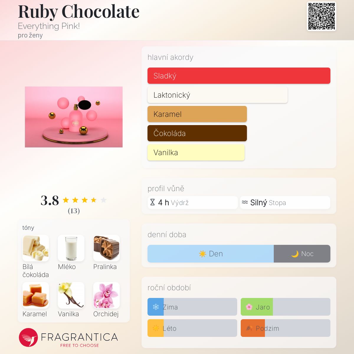 Ruby Chocolate podle Everything Pink! je Orientální Vanilla vůně pro ženy. Ruby Chocolate byl/a uveden/a v roce 2020. Vrchní tóny jsou Mléko a Karamel; střední tóny jsouBílá čokoláda a Orchidej ; základní tóny jsou Pralinka, Vanilka, Pižmo, Benzoin a Jantar (ambra).