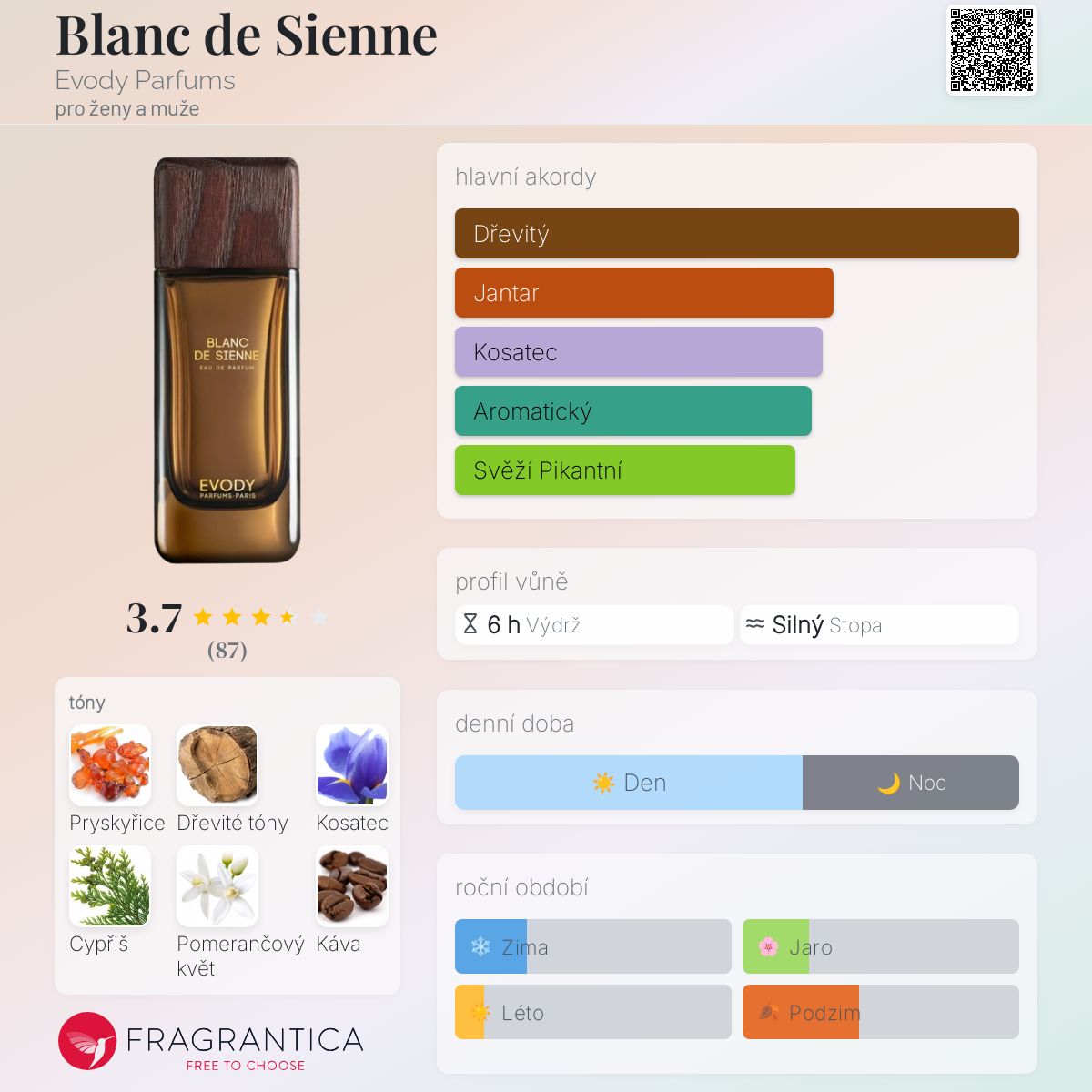 Blanc de Sienne podle Evody Parfums je vůně pro ženy a muže. Blanc de Sienne byl/a uveden/a v roce 2015. Blanc de Sienne byl/a vytvořen/a Anne-Sophie Behaghel a Amélie Bourgeois. Vrchní tóny jsou Bazalka, Bergamot a Citrón; střední tóny jsouKosatec, Cypřiš, Pomerančový květ a Fík ; základní tóny jsou Pryskyřice, Dřevité tóny a Káva.