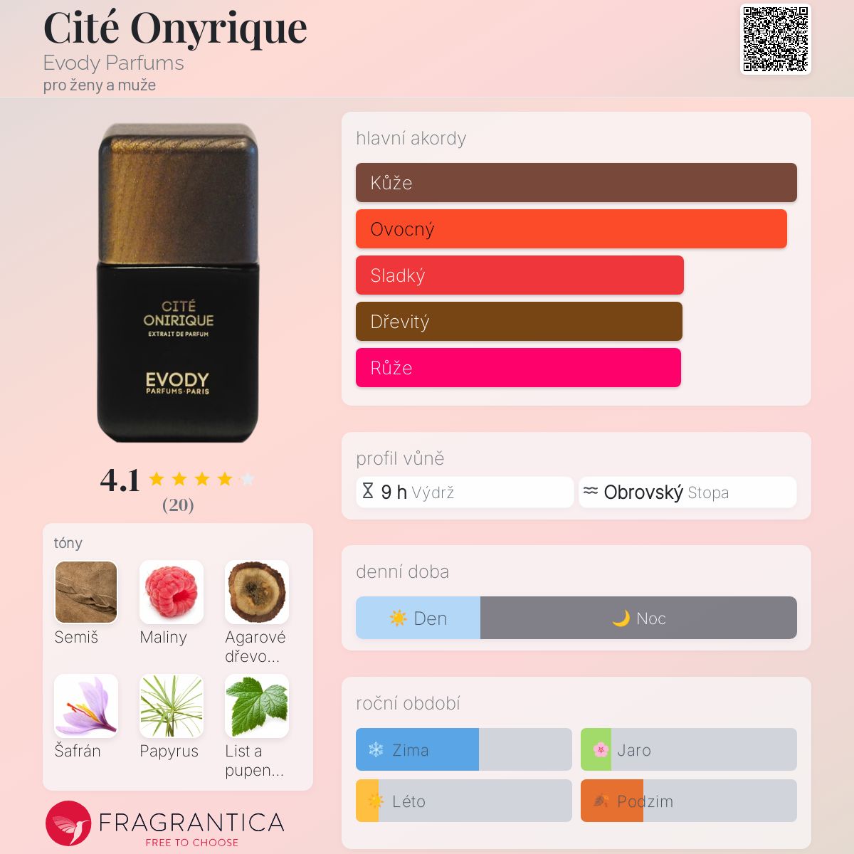 Cité Onyrique podle Evody Parfums je Orientální Floral vůně pro ženy a muže. Cité Onyrique byl/a uveden/a v roce 2019. Vrchní tóny jsou Maliny, Černý rybíz a Růžový pepř; střední tóny jsouAgarové dřevo (oud), Růže a Jasmín ; základní tóny jsou Bílý semiš, Šafrán a Papyrus.
