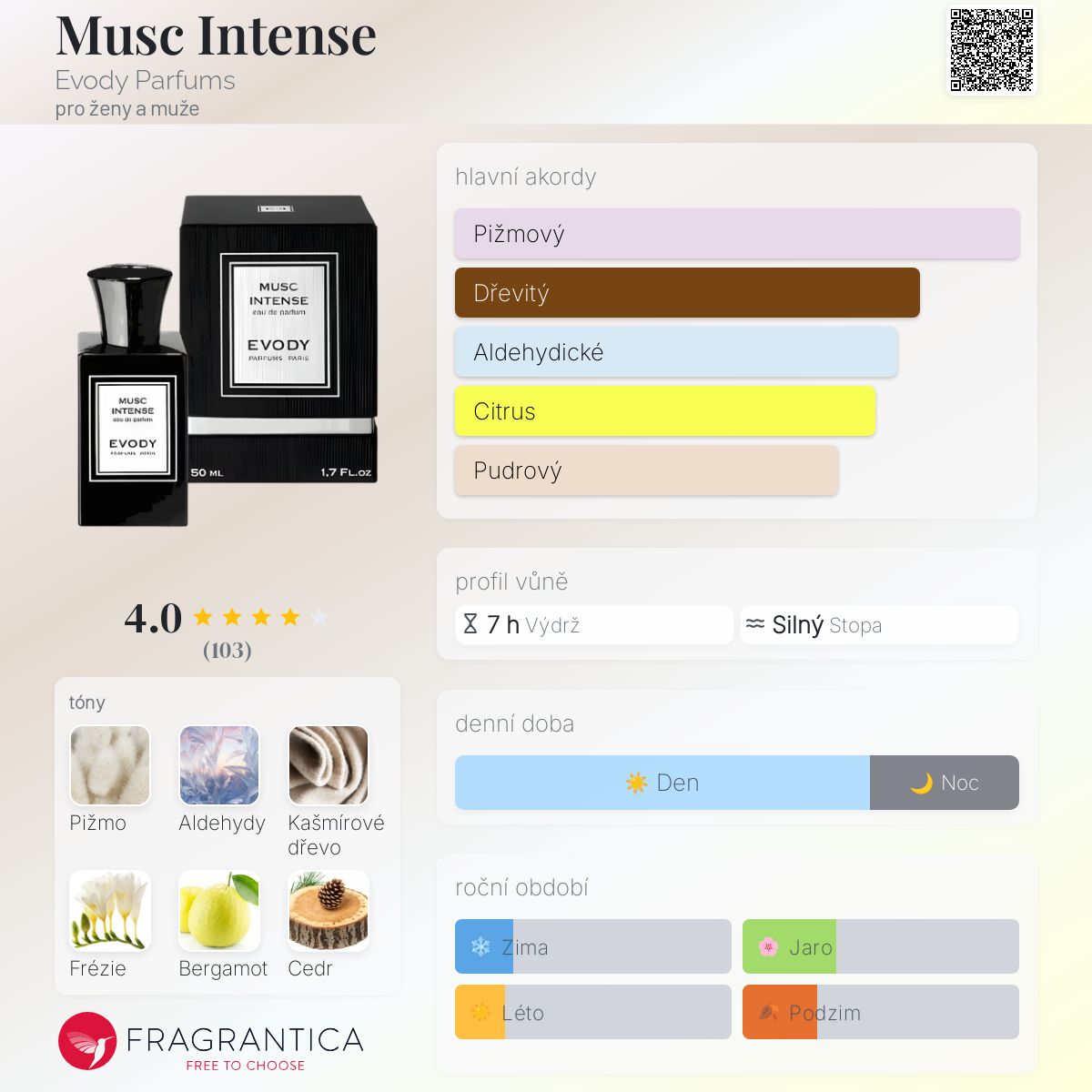 Musc Intense podle Evody Parfums je Floral Woody Musk vůně pro ženy a muže. Musc Intense byl/a uveden/a v roce 2012. Vrchní tóny jsou Aldehydy, Bergamot a Mandarinka; střední tóny jsouFrézie, Virginský cedr a Jasmín ; základní tóny jsou Pižmo, Kašmírové dřevo a Fazole tonka.