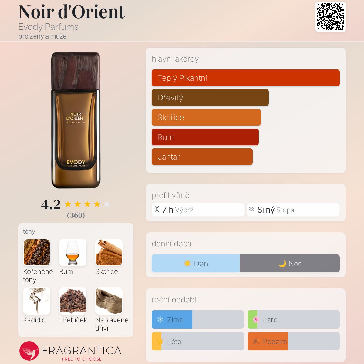 Noir d'Orient podle Evody Parfums je Woody Spicy vůně pro ženy a muže. Noir d'Orient byl/a uveden/a v roce 2014. Vrchní tóny jsou Skořice a Kadidlo; střední tóny jsouExotické koření, Rum a Hřebíček ; základní tóny jsou Naplavené dříví a Pačuli.