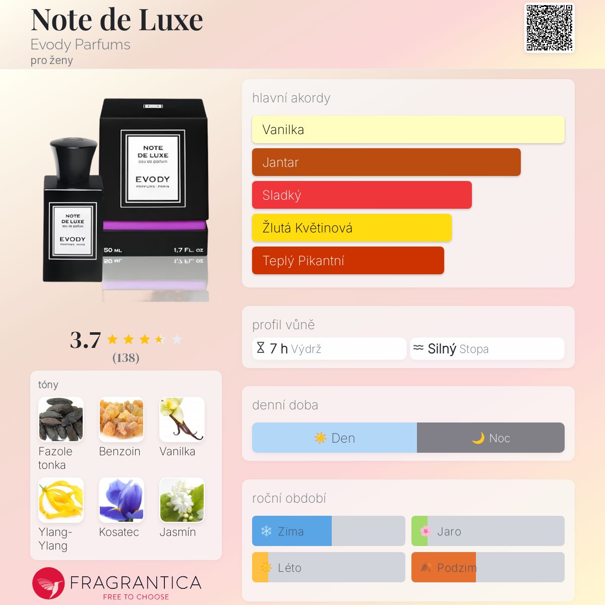 Note de Luxe podle Evody Parfums je Orientální Floral vůně pro ženy. Note de Luxe byl/a uveden/a v roce 2008. Vrchní tón je Bergamot ; střední tóny jsouYlang-Ylang, Kosatec a Jasmín ; základní tóny jsou Fazole tonka, Benzoin a Vanilka.