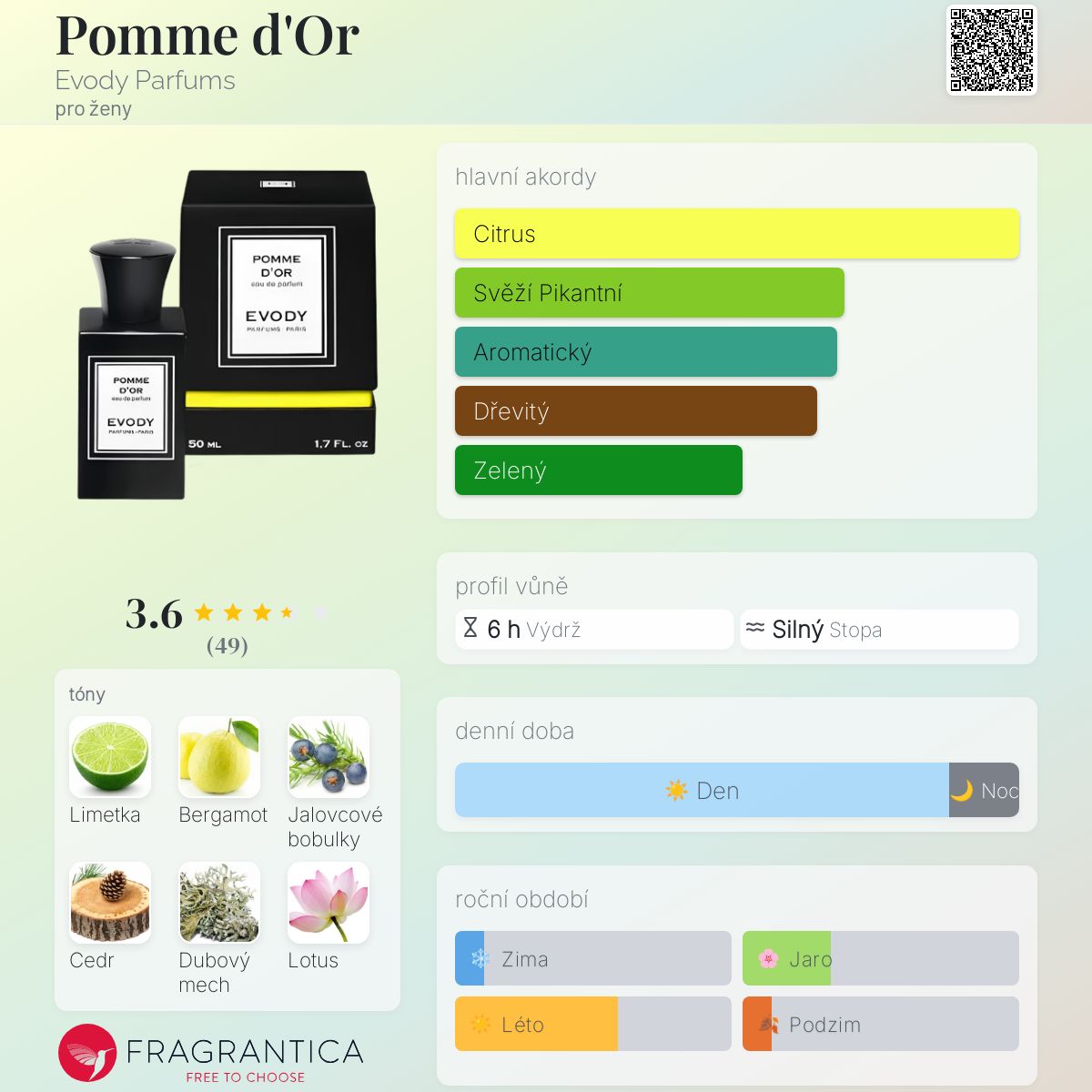 Pomme d'Or podle Evody Parfums je Aromatic Fruity vůně pro ženy. Pomme d'Or byl/a uveden/a v roce 2008. Vrchní tóny jsou Limetka a Bergamot; střední tóny jsouJalovcové bobulky a Lotus ; základní tóny jsou Virginský cedr a Dubový mech.