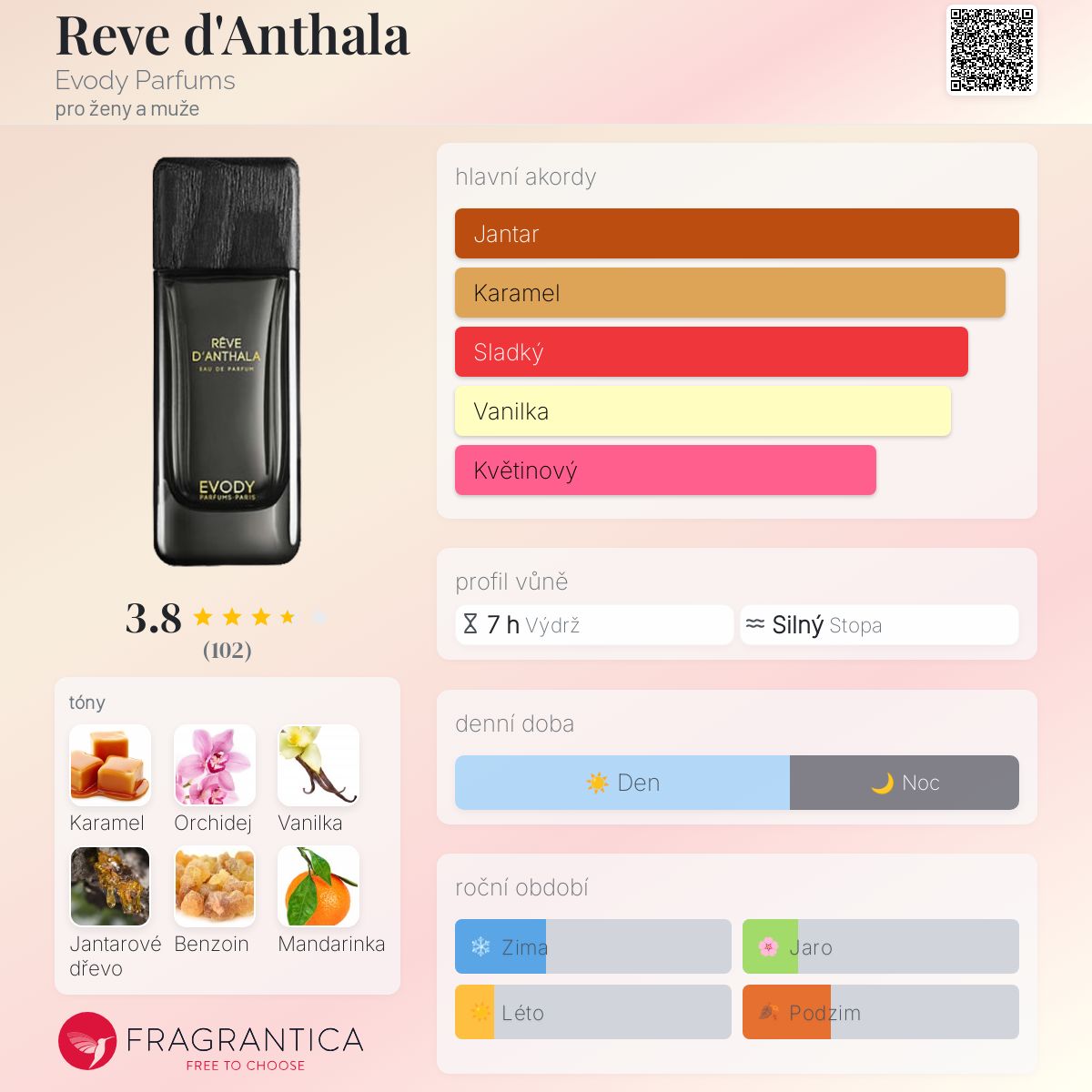 Reve d'Anthala podle Evody Parfums je Floral vůně pro ženy a muže. Reve d'Anthala byl/a uveden/a v roce 2015. "Nosem" za touto vůní je Amélie Bourgeois. Vrchní tóny jsou Žlutá mandarinka a Petitgrain; střední tóny jsouOrchidej a Jasmín mnohokvětý ; základní tóny jsou Karamel, Vanilka, Jantarové dřevo a Siamský (thajský) benzoin.