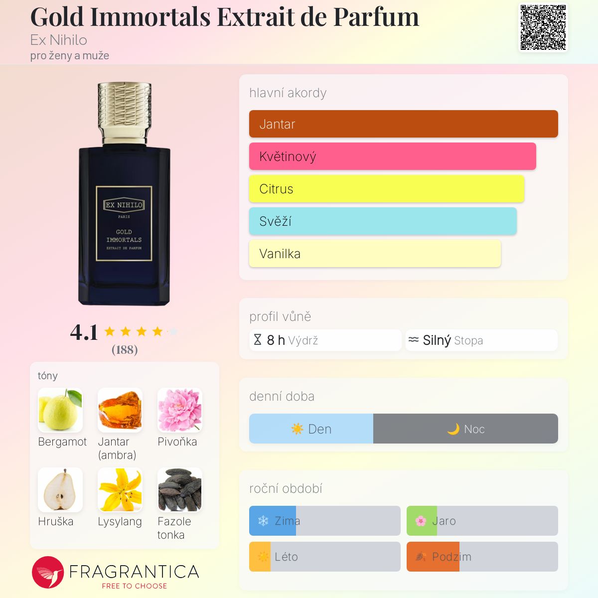 Gold Immortals Extrait de Parfum podle Ex Nihilo je Orientální Floral vůně pro ženy a muže. Gold Immortals Extrait de Parfum byl/a uveden/a v roce 2023. "Nosem" za touto vůní je Jordi Fernández. Vrchní tóny jsou Bergamot a Hruška; střední tóny jsouPivoňka a Lysylang ; základní tóny jsou Jantar (ambra), Fazole tonka a Vanilka.