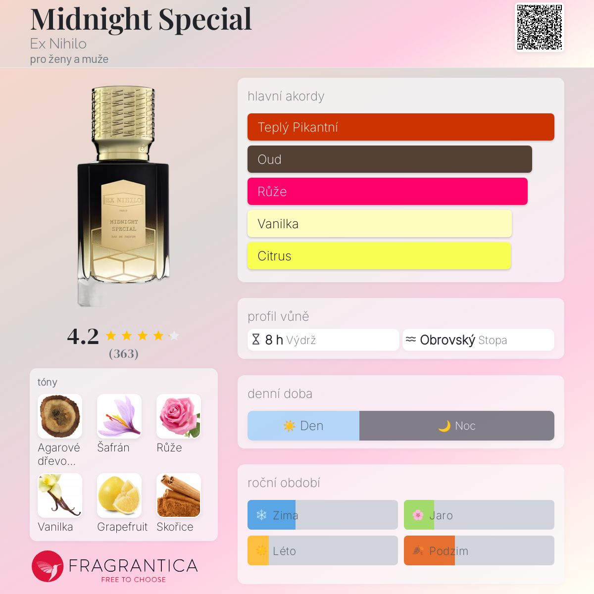 Midnight Special podle Ex Nihilo je Orientální Woody vůně pro ženy a muže. Midnight Special byl/a uveden/a v roce 2017. "Nosem" za touto vůní je Olivier Pescheux. Vrchní tóny jsou Šafrán, Skořice a Černý pepř; střední tóny jsouTurecká růže, Růže a Grapefruit ; základní tóny jsou Agarové dřevo (oud), Vanilka a Pačuli.
