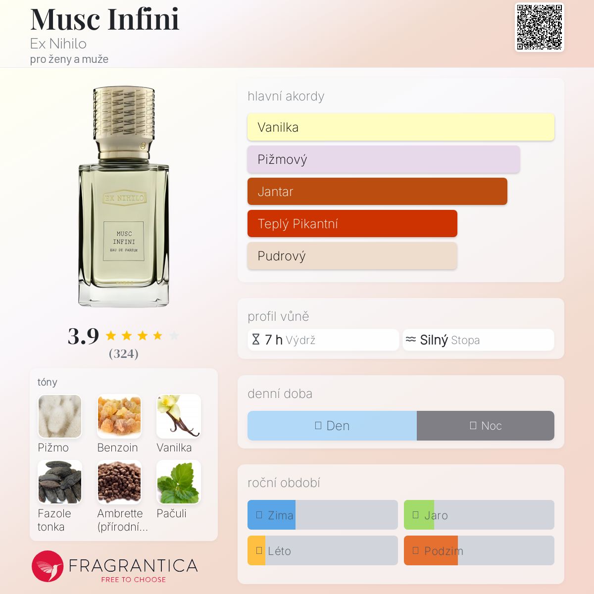 Musc Infini podle Ex Nihilo je Orientální vůně pro ženy a muže. Musc Infini byl/a uveden/a v roce 2014. "Nosem" za touto vůní je Louise Turner. Vrchní tóny jsou Ambrette (přírodní pižmo), Kalábrijský bergamot a Grapefruit; střední tóny jsouPižmo, Pačuli a Růže ; základní tóny jsou Bílé pižmo, Benzoin, Vanilka a Fazole tonka.