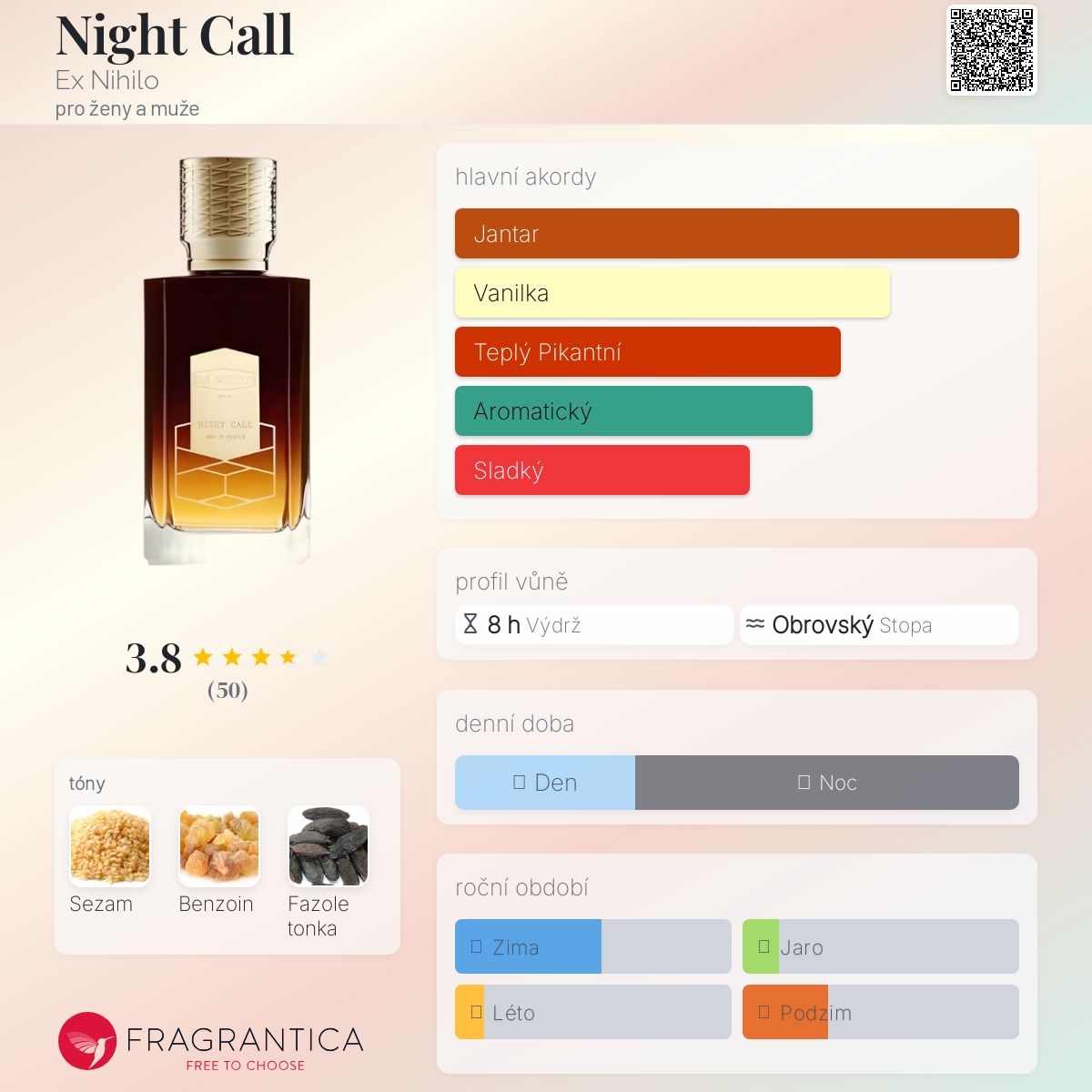 Night Call podle Ex Nihilo je Orientální Spicy vůně pro ženy a muže. Night Call byl/a uveden/a v roce 2017. Vrchní tón je Sezam ; střední tón jeBenzoin ; základní tón je Fazole tonka.