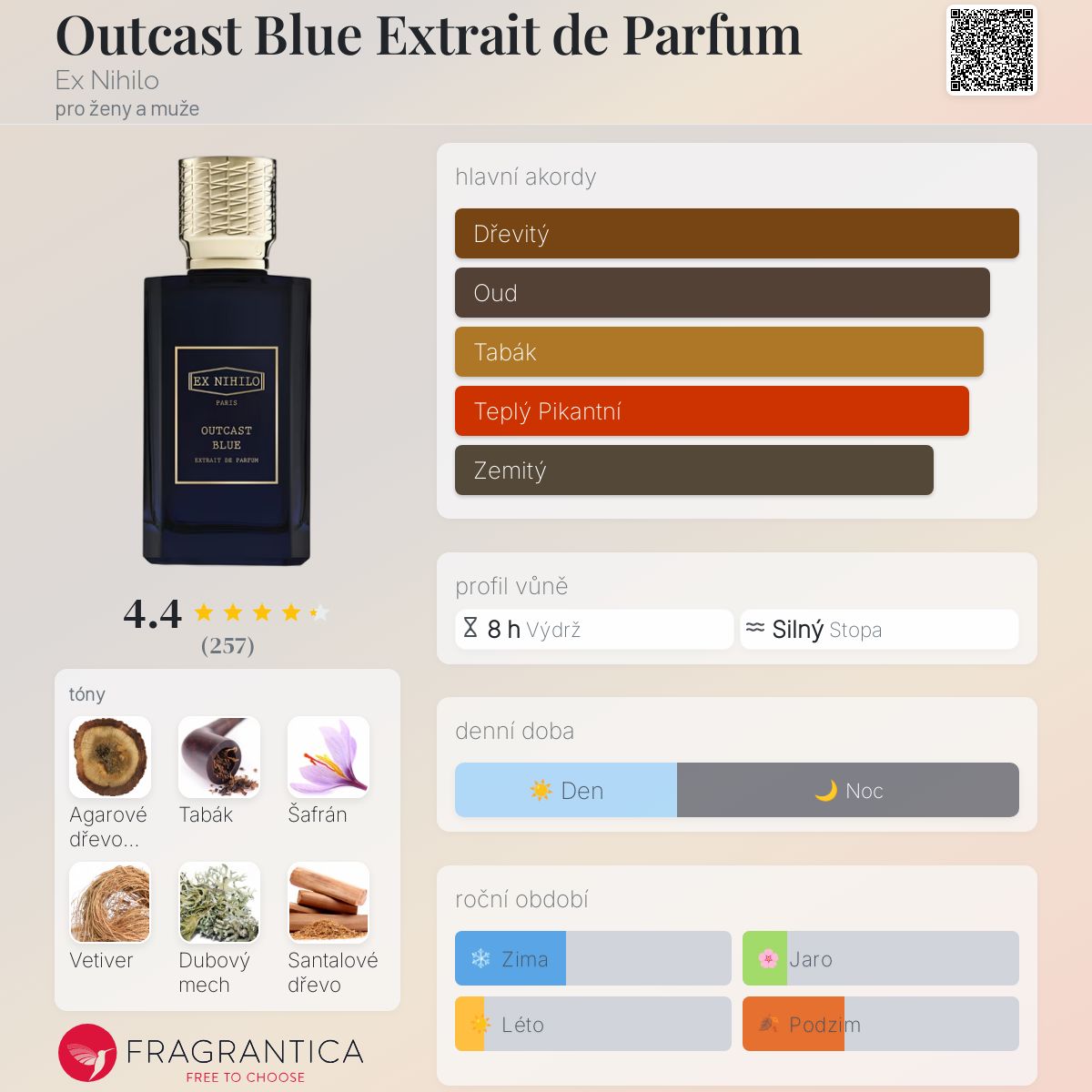 Outcast Blue Extrait de Parfum podle Ex Nihilo je Aromatic Spicy vůně pro ženy a muže. Outcast Blue Extrait de Parfum byl/a uveden/a v roce 2022. "Nosem" za touto vůní je Jordi Fernández. Vrchní tóny jsou Šafrán a Černý pepř; střední tón jeKonvalinka ; základní tóny jsou Agarové dřevo (oud), Tabák, Vetiver, Mech a Santalové dřevo.
