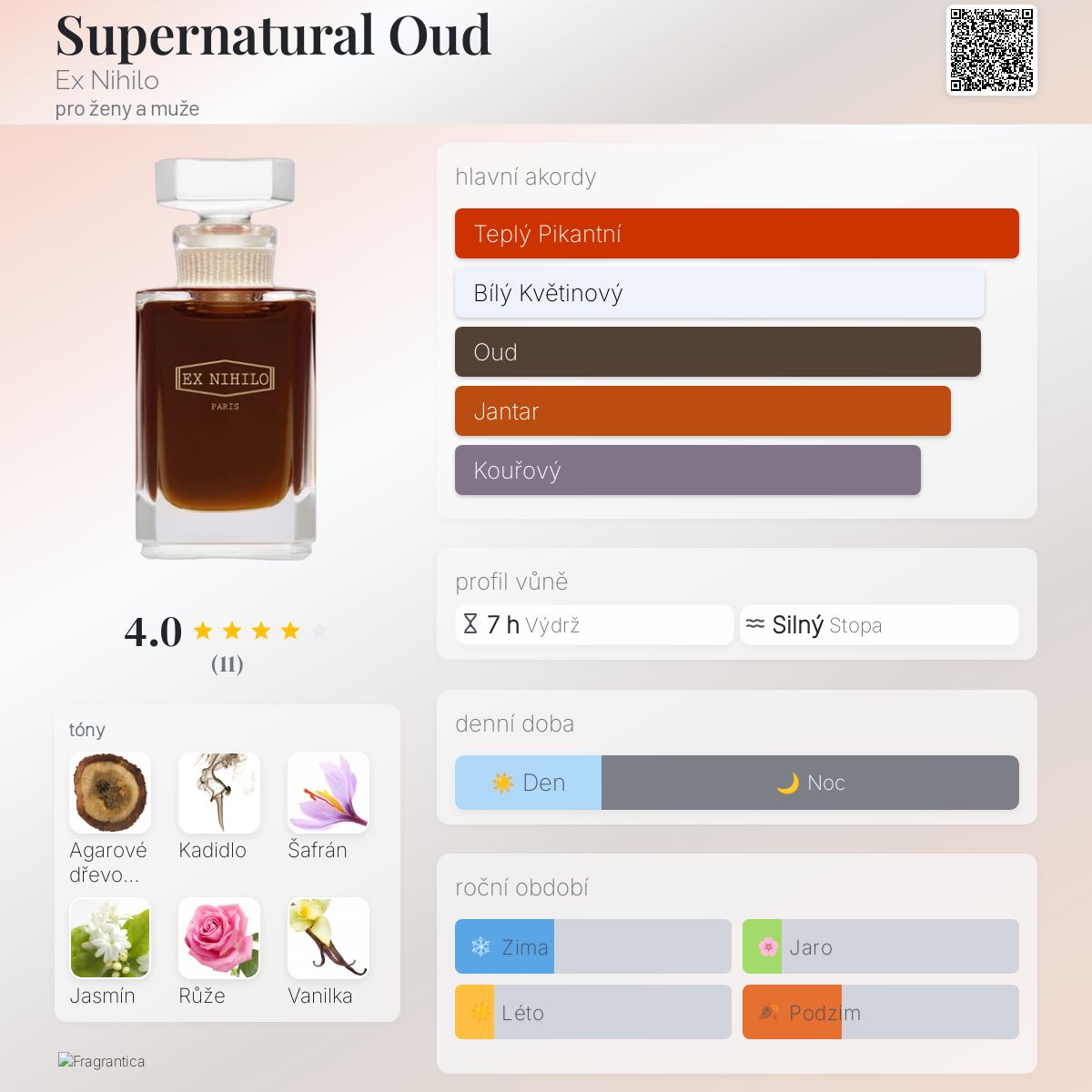 Supernatural Oud podle Ex Nihilo je vůně pro ženy a muže. "Nosem" za touto vůní je Jordi Fernández. Vrchní tóny jsou Šafrán a Růže; střední tóny jsouAgarové dřevo (oud), Jasmín a Lysylang ; základní tóny jsou Kadidlo, Vanilka a Pižmo.