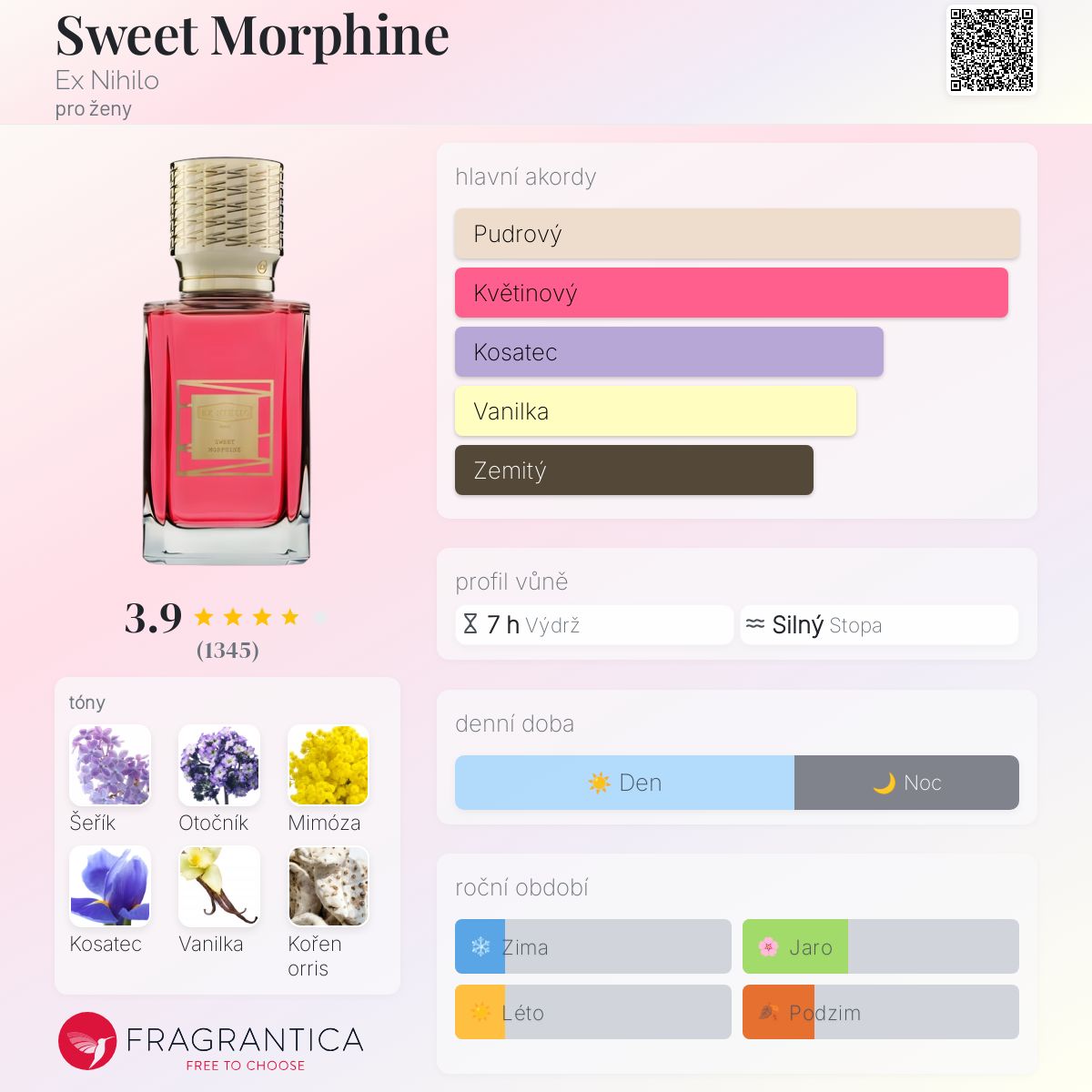 Sweet Morphine podle Ex Nihilo je Floral vůně pro ženy. Sweet Morphine byl/a uveden/a v roce 2015. "Nosem" za touto vůní je Natalie Gracia-Cetto. Vrchní tóny jsou Šeřík a Bergamot; střední tóny jsouMimóza, Kosatec a Růže ; základní tóny jsou Otočník, Bourbonská vanilka, Orris, Vetiver a Pačuli.