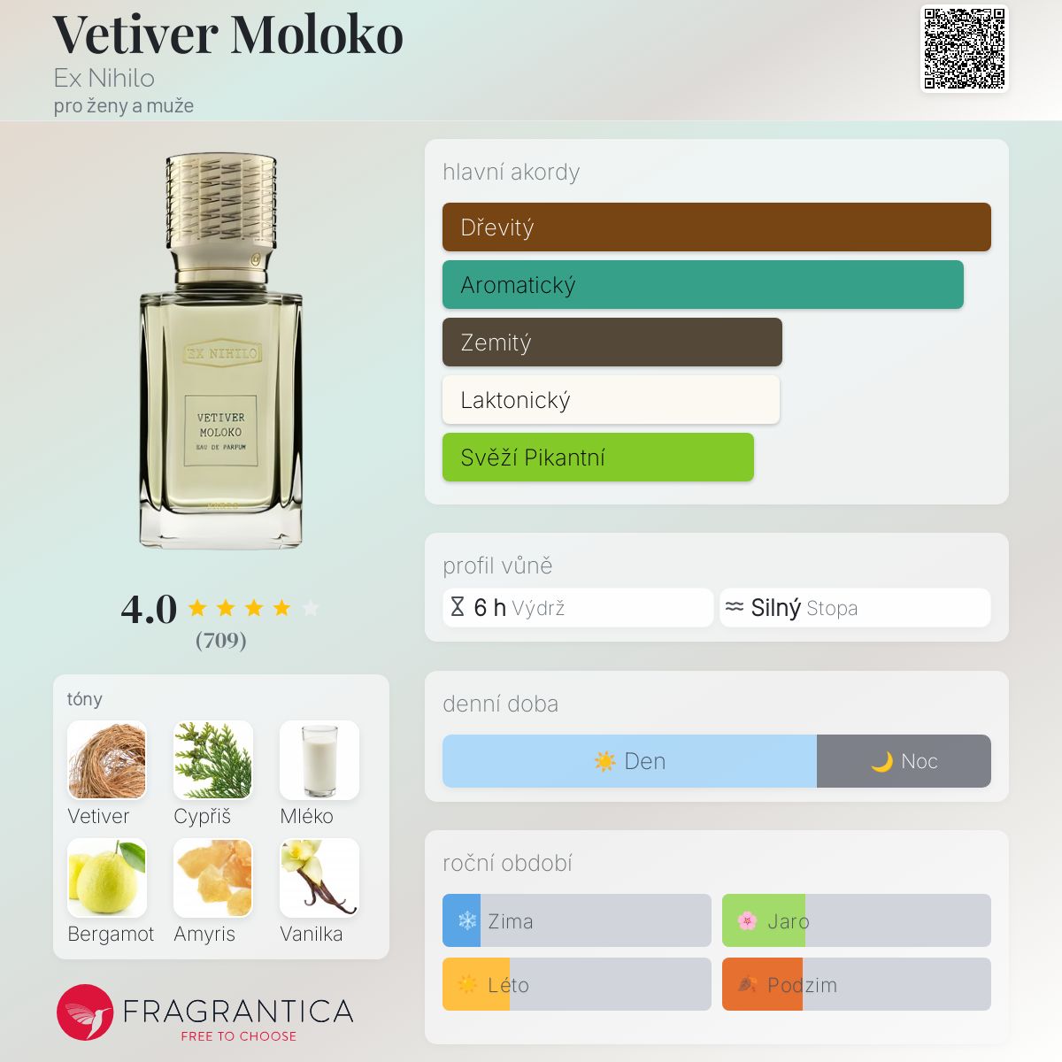 Vetiver Moloko podle Ex Nihilo je Woody vůně pro ženy a muže. Vetiver Moloko byl/a uveden/a v roce 2014. "Nosem" za touto vůní je Givaudan. Vrchní tóny jsou Bergamot a Bulharská růže; střední tóny jsouCypřiš a Mléko ; základní tóny jsou Vetiver, Amyris a Madagaskarská vanilka.