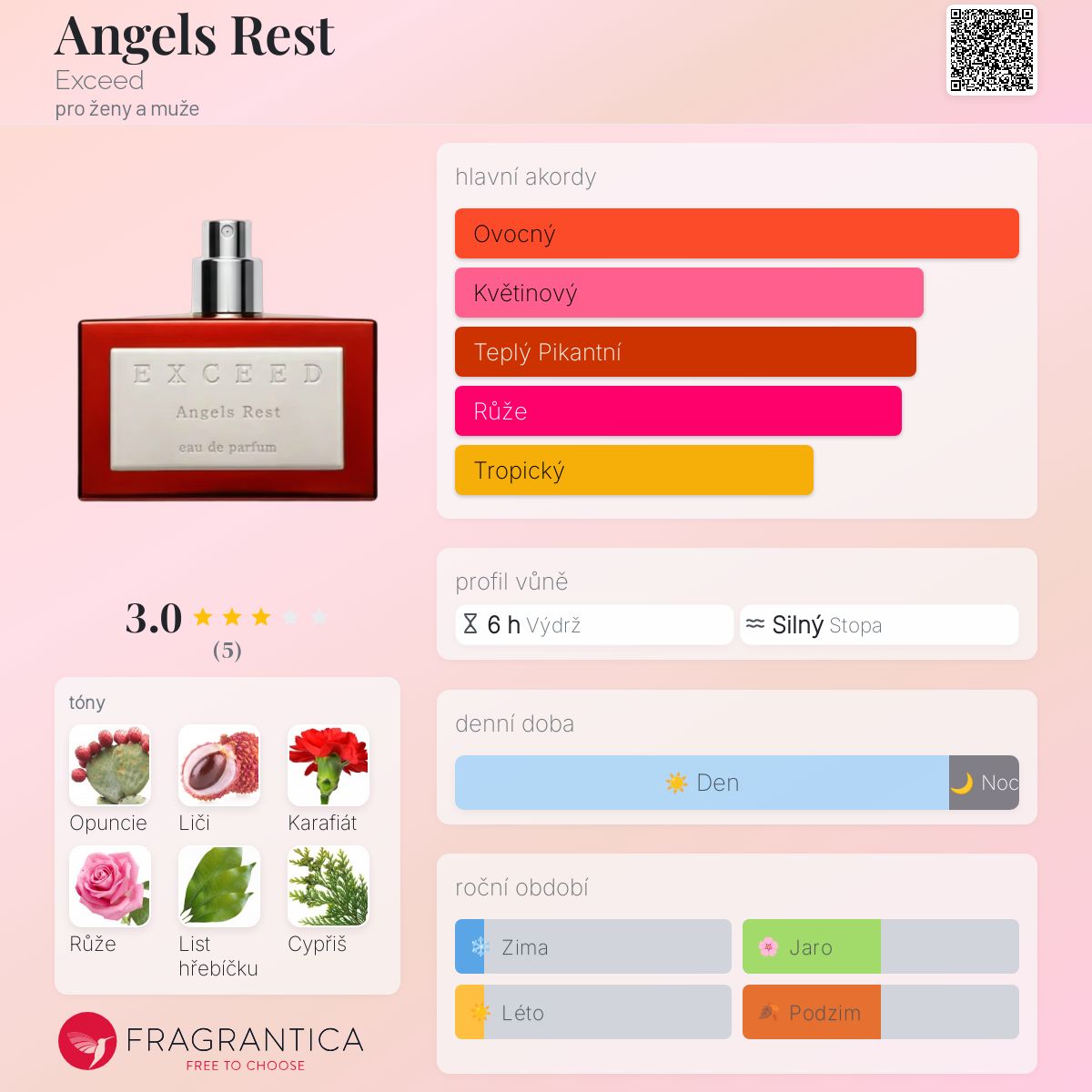Angels Rest podle Exceed je Orientální Spicy vůně pro ženy a muže. Toto je nová vůně. Angels Rest byl/a uveden/a v roce 2025. "Nosem" za touto vůní je Rita Brena. Vrchní tóny jsou Liči, List hřebíčku, Cypřiš a Galbanum; střední tóny jsouOpuncie, Karafiát a Růže ; základní tóny jsou Jantar (ambra), Santalové dřevo a Benzoin.