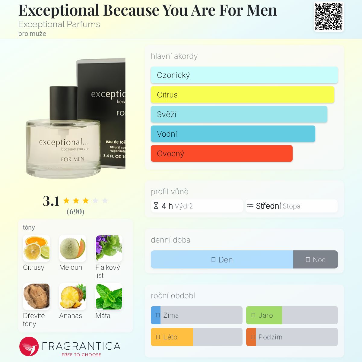 Exceptional Because You Are For Men podle Exceptional Parfums je Aromatic Fruity vůně pro muže. Exceptional Because You Are For Men byl/a uveden/a v roce 2008.