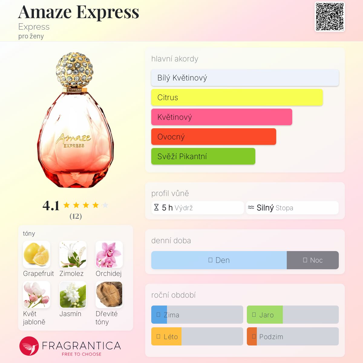 Amaze Express podle Express je Floral Fruity vůně pro ženy. Amaze Express byl/a uveden/a v roce 2016. Vrchní tóny jsou Grapefruit, Zimolez a Květ jabloně; střední tóny jsouBílá orchidej a Jasmín ; základní tóny jsou Bílé dřevo a Vanilka.