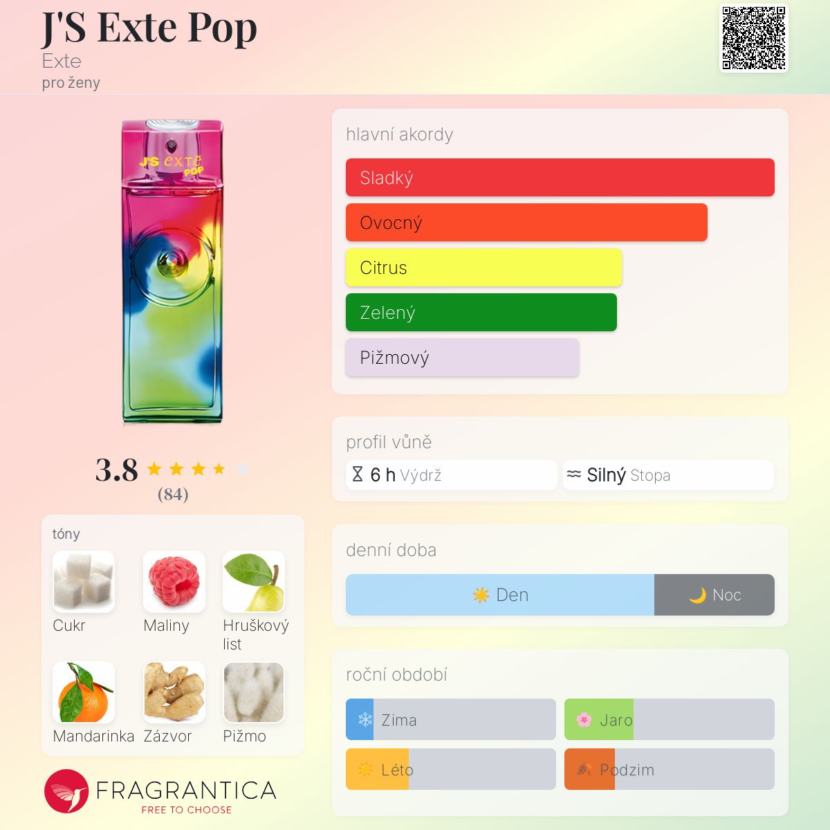 J'S Exte Pop podle Exte je Floral Fruity vůně pro ženy. J'S Exte Pop byl/a uveden/a v roce 2007. "Nosem" za touto vůní je Jean-Pierre Bethouart. Vrchní tóny jsou Hruškový list, Mandarinka a Pomerančový květ; střední tóny jsouMaliny, Zázvor a Šeřík ; základní tóny jsou Cukr, Pižmo a Cedr.