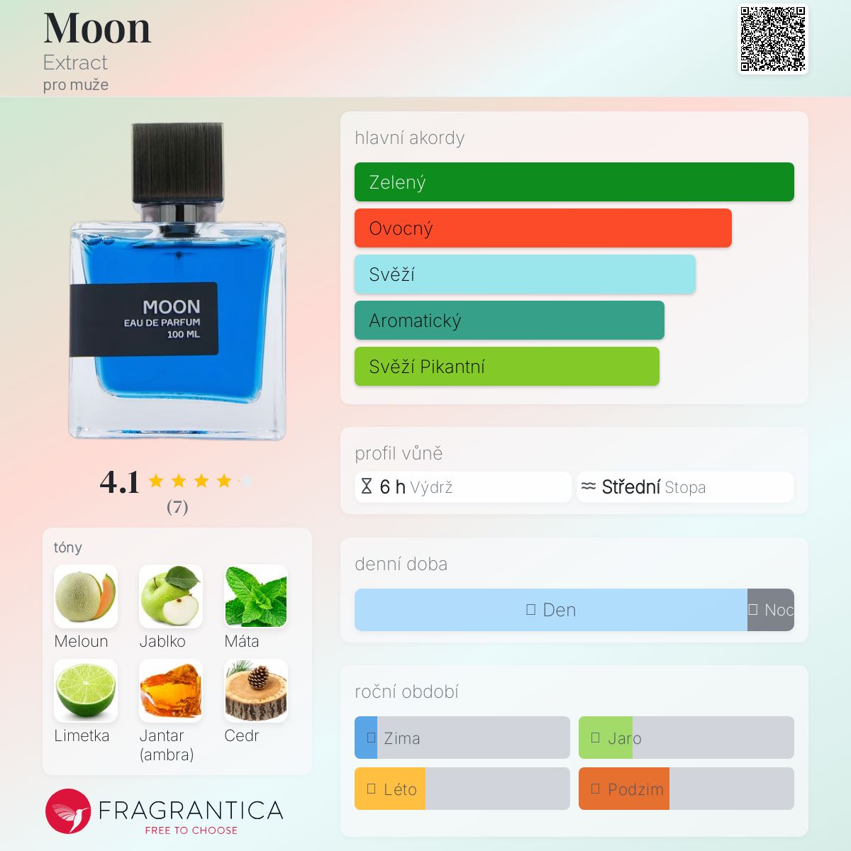 Moon podle Extract je vůně pro muže. Moon byl/a uveden/a v roce 2022. Vrchní tóny jsou Meloun, Máta a Limetka; střední tóny jsouZelené jablko, Extrakt z bílého cedru a Káva ; základní tóny jsou Jantar (ambra) a Dřevité tóny.