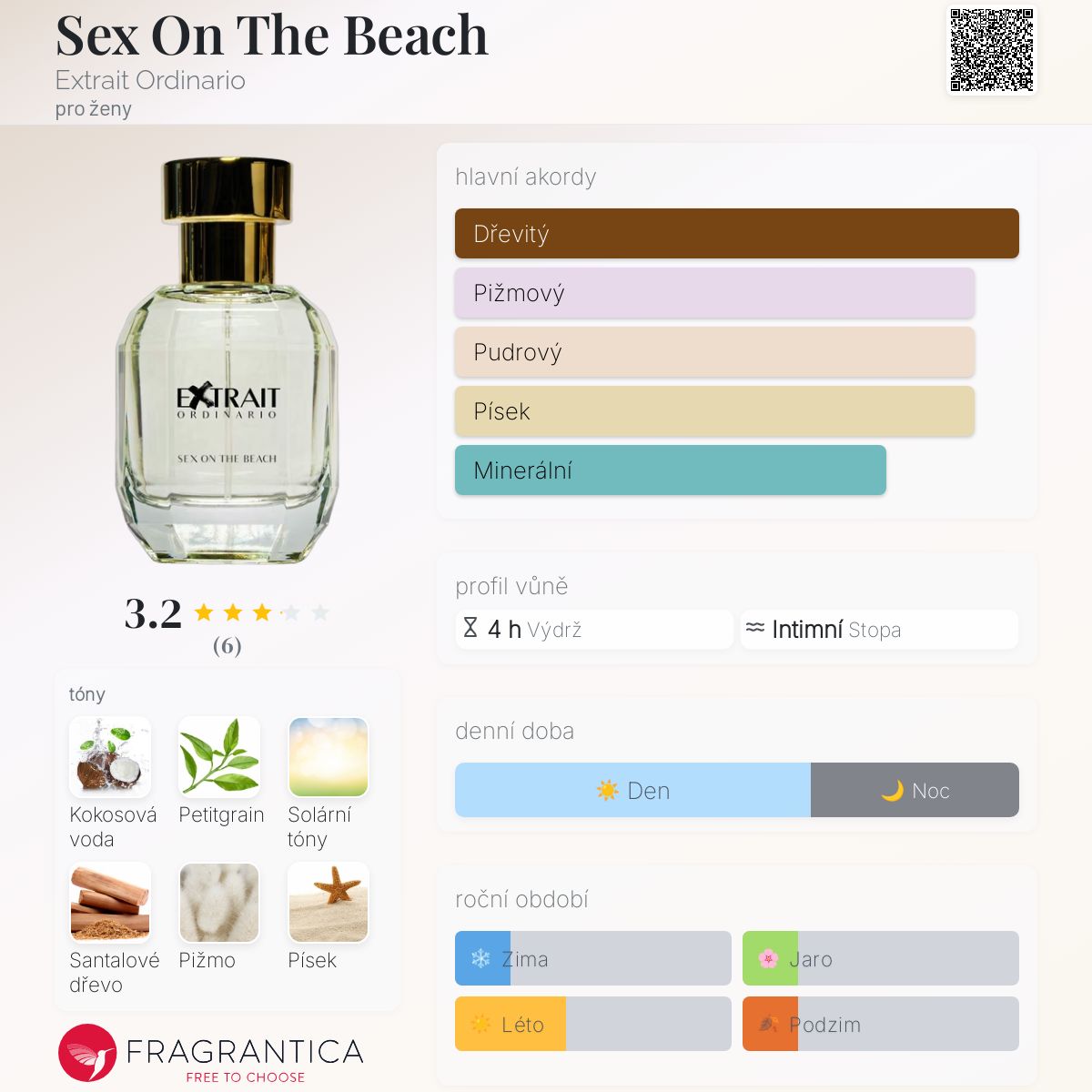 Sex On The Beach podle Extrait Ordinario je Floral Fruity vůně pro ženy. Toto je nová vůně. Sex On The Beach byl/a uveden/a v roce 2024. Vrchní tóny jsou Kokosová voda, Petitgrain a Citrusy; střední tóny jsouSolární tóny, Květ tiare a Ananas ; základní tóny jsou Santalové dřevo, Pižmo a Písek.