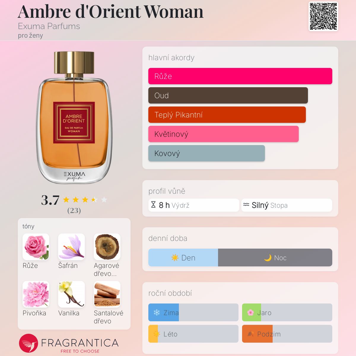 Ambre d'Orient Woman podle Exuma Parfums je Orientální Floral vůně pro ženy. Ambre d'Orient Woman byl/a uveden/a v roce 2018. Vrchní tóny jsou Bergamot a Květ jabloně; střední tóny jsouRůže, Šafrán a Pivoňka ; základní tóny jsou Agarové dřevo (oud), Vanilka a Santalové dřevo.