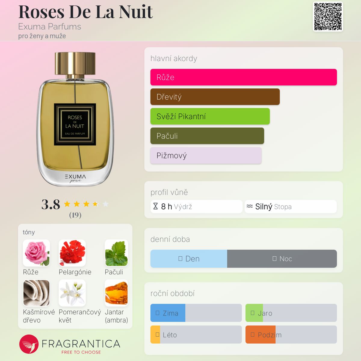 Roses De La Nuit podle Exuma Parfums je Chypre Floral vůně pro ženy a muže. Roses De La Nuit byl/a uveden/a v roce 2019. "Nosem" za touto vůní je Jordi Fernández. Vrchní tóny jsou Damašská růže a Pelargónie; střední tóny jsouPačuli, Kašmírové dřevo a Pomerančový květ ; základní tóny jsou Jantar (ambra), Pižmo a Vanilka.