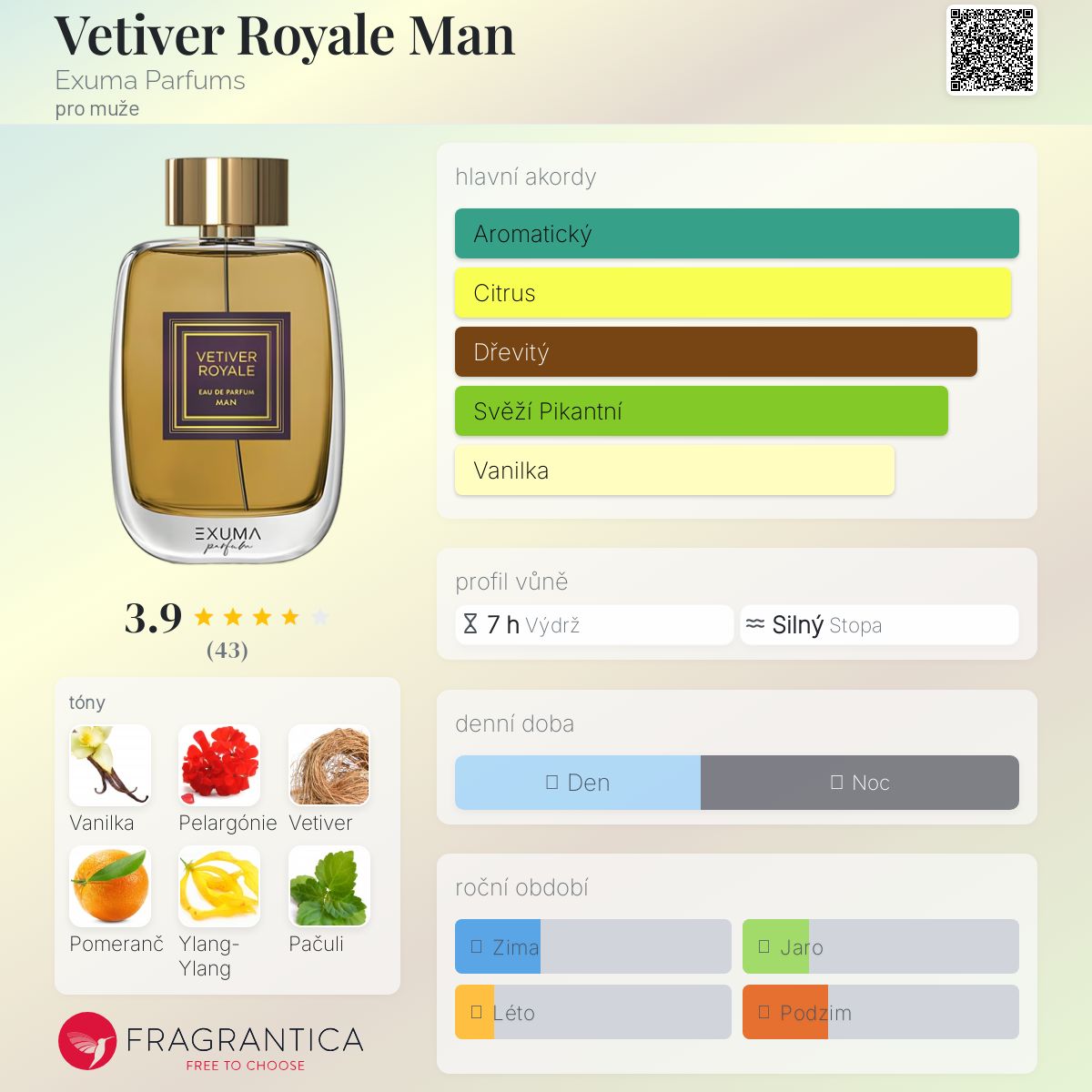 Vetiver Royale Man podle Exuma Parfums je Chypre Floral vůně pro muže. Vetiver Royale Man byl/a uveden/a v roce 2018. Vrchní tóny jsou Pomeranč, Bergamot a Citrón; střední tóny jsouPelargónie, Ylang-Ylang a Jasmín ; základní tóny jsou Vanilka, Vetiver a Pačuli.