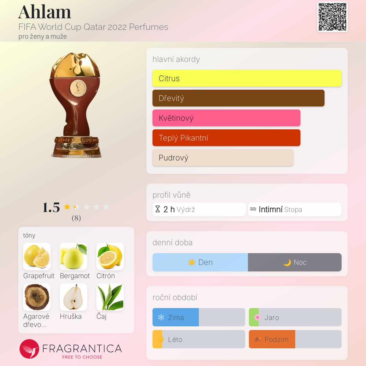 Ahlam podle FIFA World Cup Qatar 2022 Perfumes je vůně pro ženy a muže. Ahlam byl/a uveden/a v roce 2022. "Nosem" za touto vůní je Ali Alzaabi. Vrchní tóny jsou Grapefruit, Bergamot, Citrón, Agarové dřevo (oud), Hruška, Čaj a Šípek; střední tóny jsouEgyptský jasmín, Ylang-Ylang, Pomeranč, Kamélie, Tuberóza a Višňový květ ; základní tóny jsou Skořice, Šafrán, Pačuli, Dubový mech, Santalové dřevo, Agarové dřevo (oud), Kořen orris, Ambra, Pižmo a Kašmírové dřevo.
