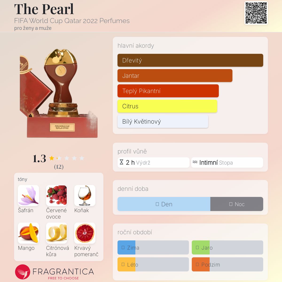 The Pearl podle FIFA World Cup Qatar 2022 Perfumes je vůně pro ženy a muže. The Pearl byl/a uveden/a v roce 2022. "Nosem" za touto vůní je Ali Alzaabi. Vrchní tóny jsou Šafrán, Červené ovoce, Koňak, Mango, Citrónová kůra a Krvavý pomeranč; střední tóny jsouKoření, Kašmírové dřevo, Jantarové dřevo, Egyptský jasmín, Marocká růže a Pomerančový květ ; základní tóny jsou Cedr, Dubový mech, Santalové dřevo, Bílé pižmo, Madagaskarská vanilka, Jantar (ambra) a Ambrocenide.