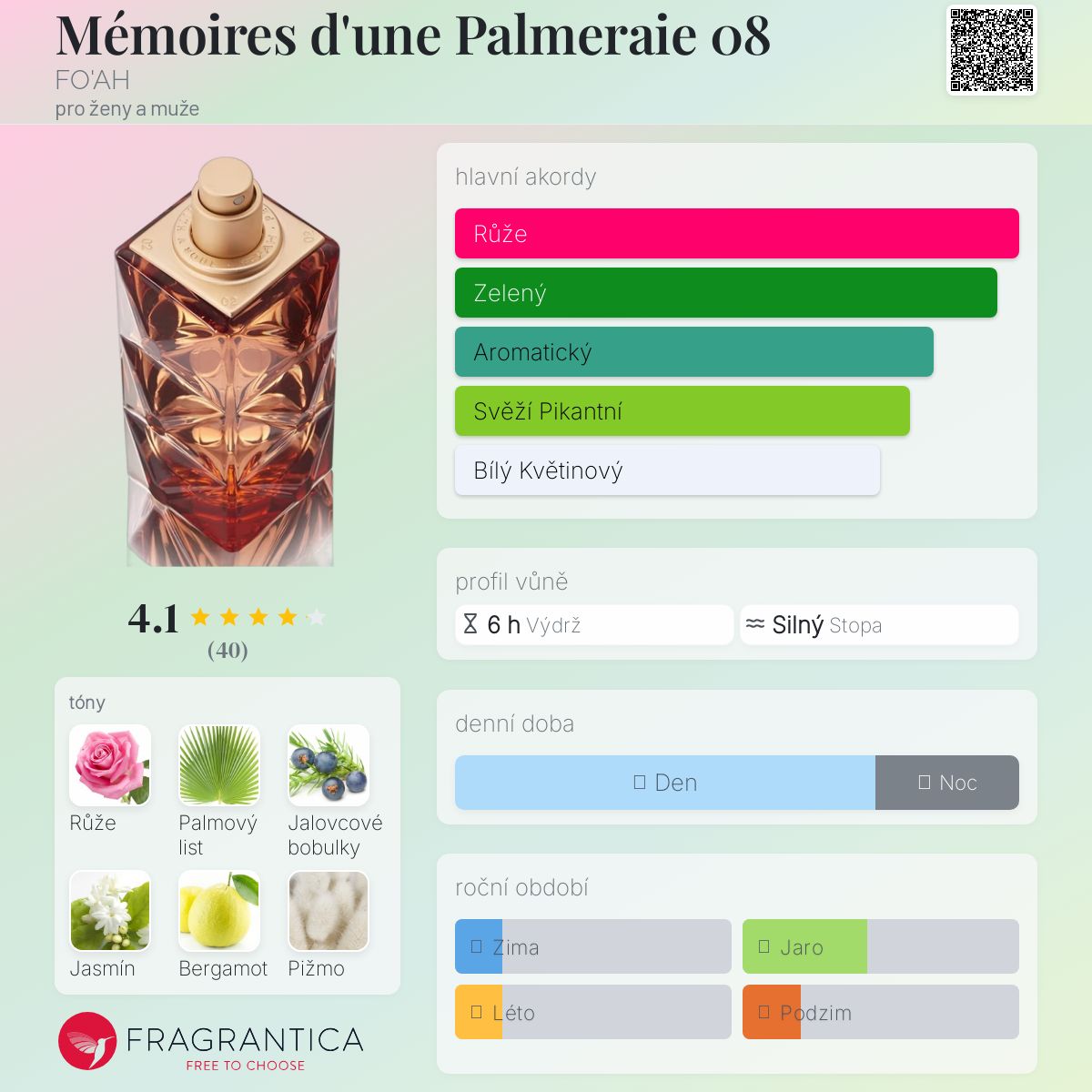 Mémoires d'une Palmeraie 08 podle FO'AH je Chypre Floral vůně pro ženy a muže. Mémoires d'une Palmeraie 08 byl/a uveden/a v roce 2018. "Nosem" za touto vůní je Olivier Pescheux. Vrchní tóny jsou Jalovcové bobulky a Kalábrijský bergamot; střední tóny jsouKvětná růže a Jasmín ; základní tóny jsou Palma, Pižmo a Pačuli.