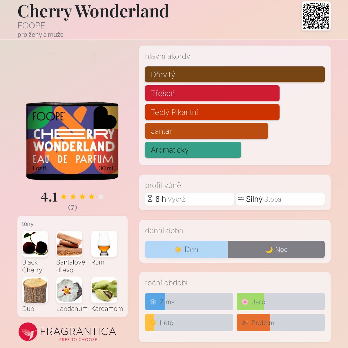 Cherry Wonderland podle FOOPE je Aromatic Fruity vůně pro ženy a muže. Cherry Wonderland byl/a uveden/a v roce 2023. "Nosem" za touto vůní je Julie Pluchet. Vrchní tóny jsou Černá třešeň, Rum, Kardamom, Sladký pomeranč a Anýz; střední tóny jsouDub, Pačuli a Fialka ; základní tóny jsou Santalové dřevo, Labdanum, Olibanum a Mech.