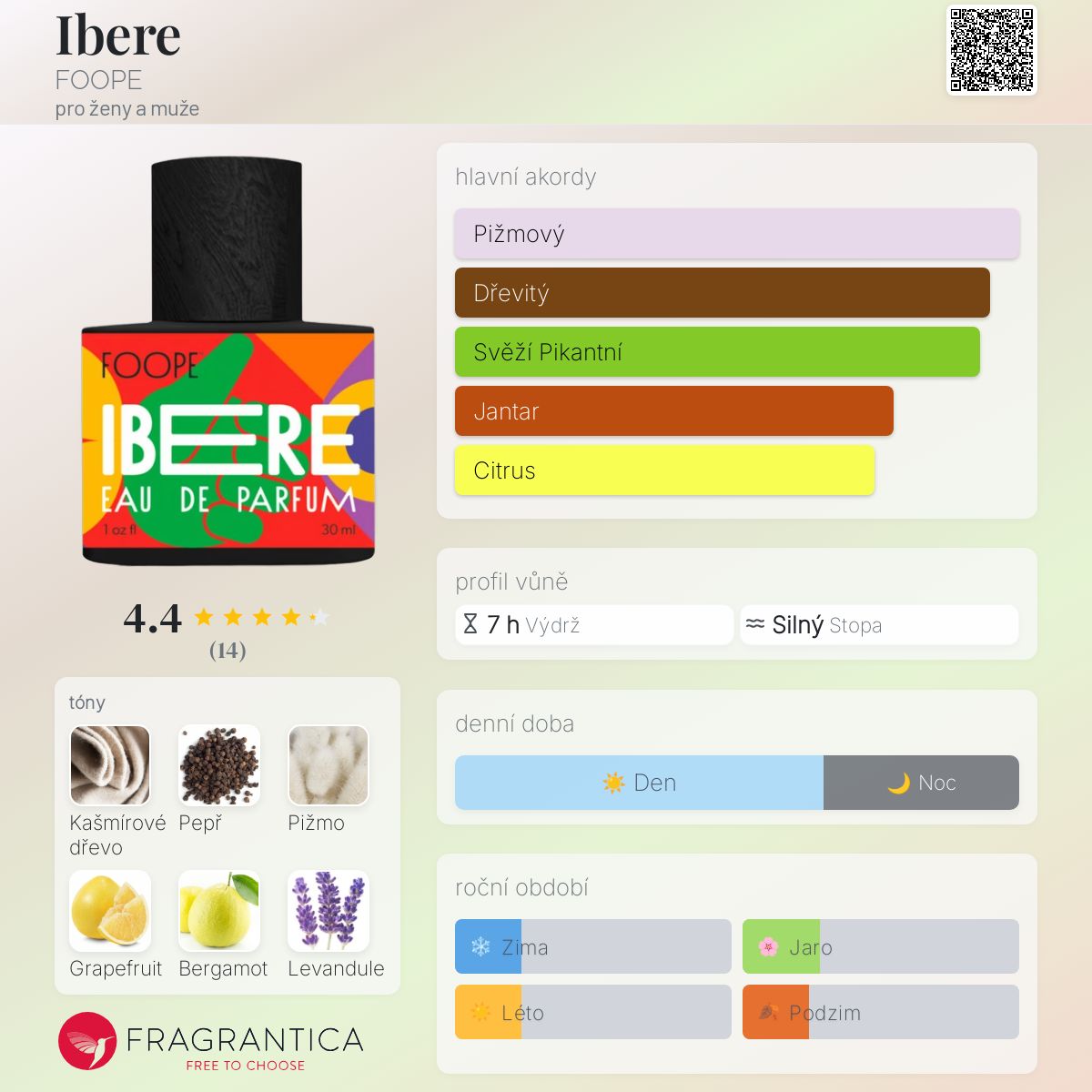 Ibere podle FOOPE je Woody vůně pro ženy a muže. Ibere byl/a uveden/a v roce 2022. Vrchní tóny jsou Černý pepř, Grapefruit a Bergamot; střední tóny jsouKašmírské dřevo a Levandule ; základní tóny jsou Pižmo, Jantar (ambra) a Vetiver.