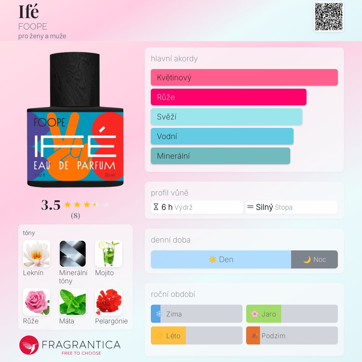 Ifé podle FOOPE je Citrus vůně pro ženy a muže. Ifé byl/a uveden/a v roce 2022. "Nosem" za touto vůní je Romain Keller. Vrchní tóny jsou Minerální tóny, Máta, Bergamot a Koření; střední tóny jsouLeknín, Mojito, Růže, Damašská růže a Pelargónie ; základní tóny jsou Cedr, Jantar (ambra) a Pižmo.