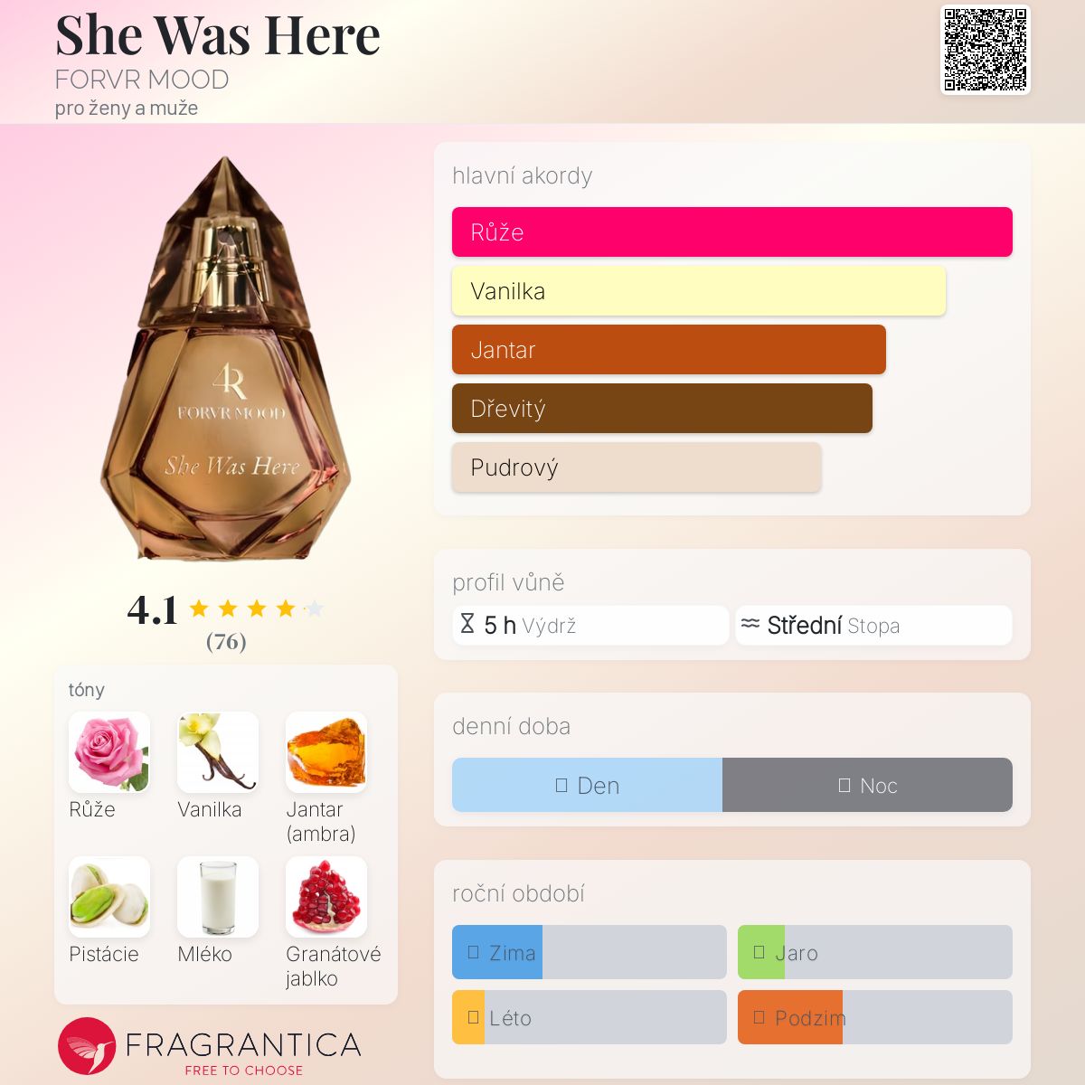 She Was Here podle FORVR MOOD je Floral Woody Musk vůně pro ženy a muže. Toto je nová vůně. She Was Here byl/a uveden/a v roce 2025. Vrchní tóny jsou Granátové jablko a Elimi; střední tóny jsouTurecká růže, Vanilka, Pistácie a Mléko ; základní tóny jsou Jantar (ambra) a Semiš.