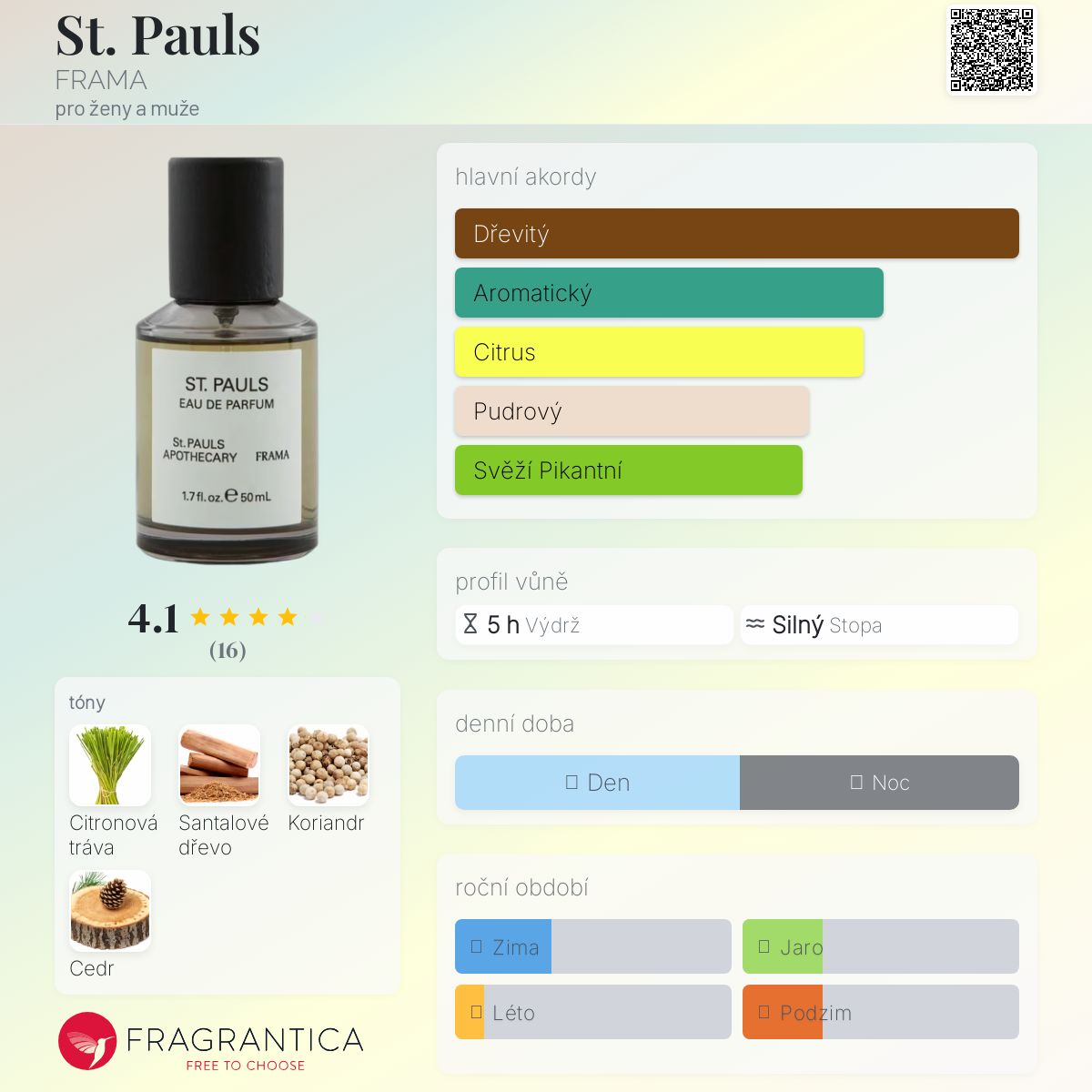 St. Pauls podle FRAMA je Woody Spicy vůně pro ženy a muže. St. Pauls byl/a uveden/a v roce 2016. "Nosem" za touto vůní je Lena Norling.