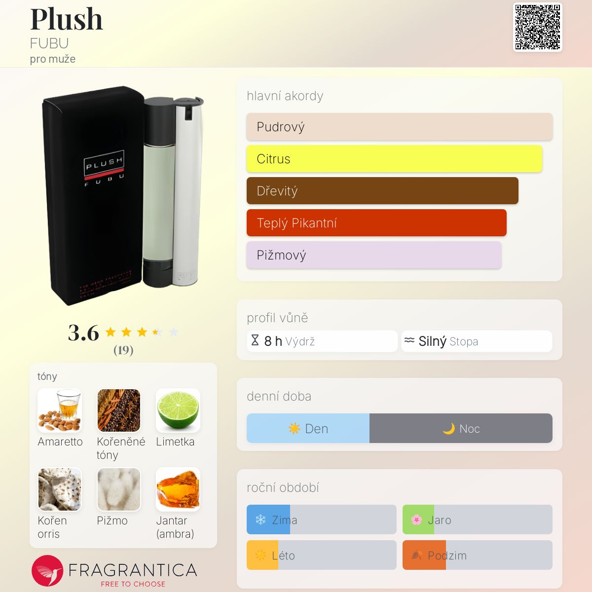 Plush podle FUBU je Orientální Woody vůně pro muže. Plush byl/a uveden/a v roce 2002. Plush byl/a vytvořen/a Alienor Massenet a Jean-Marc Chaillan. Vrchní tóny jsou Amaretto, Limetka, Bergamot, Semiš a Bazalka; střední tóny jsouKoření a Kořen orris ; základní tóny jsou Pižmo, Jantar (ambra), Santalové dřevo a Pačuli.