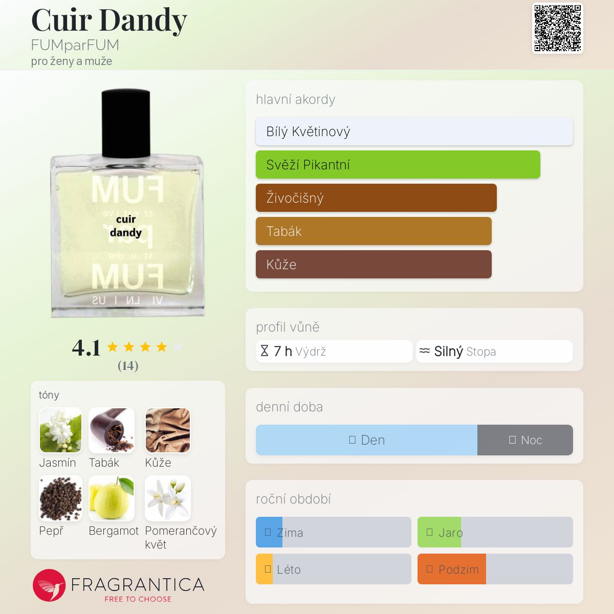Cuir Dandy podle FUMparFUM je vůně pro ženy a muže. Cuir Dandy byl/a uveden/a v roce 2017. "Nosem" za touto vůní je Aistis Mickevičius. Vrchní tóny jsou Bergamot a Pomerančový květ; střední tóny jsouMarocký jasmín, Tabák, Bílý pepř, Bobkový list a Tulipán ; základní tóny jsou Kůže, Ambra, Jantar (ambra), Bílý jantar (ambra) a Bílé pižmo.