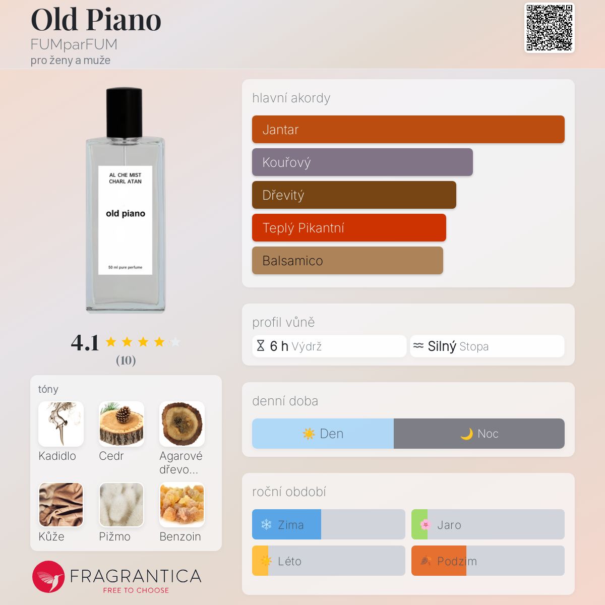 Old Piano podle FUMparFUM je vůně pro ženy a muže. Old Piano byl/a uveden/a v roce 2019. "Nosem" za touto vůní je Aistis Mickevičius.