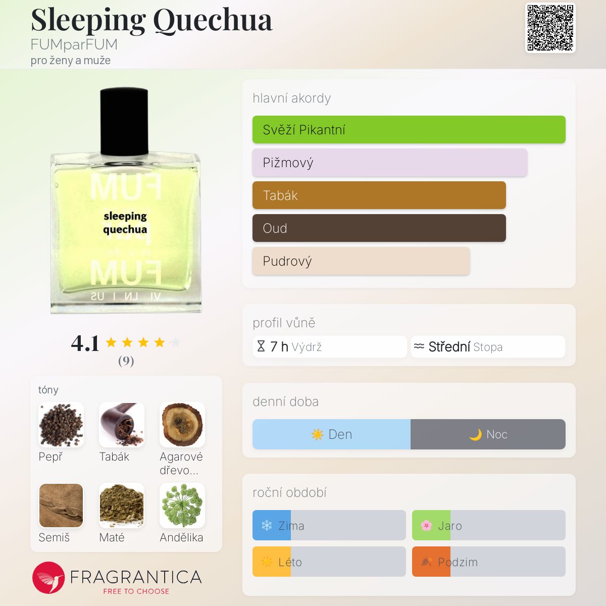 Sleeping Quechua podle FUMparFUM je vůně pro ženy a muže. Sleeping Quechua byl/a uveden/a v roce 2022. "Nosem" za touto vůní je Aistis Mickevičius. Vrchní tóny jsou Bílý pepř, Maté a Andělika; střední tóny jsouTabák a Jasmín ; základní tóny jsou Agarové dřevo (oud), Semiš, Jantar (ambra), Pačuli a Pižmo.