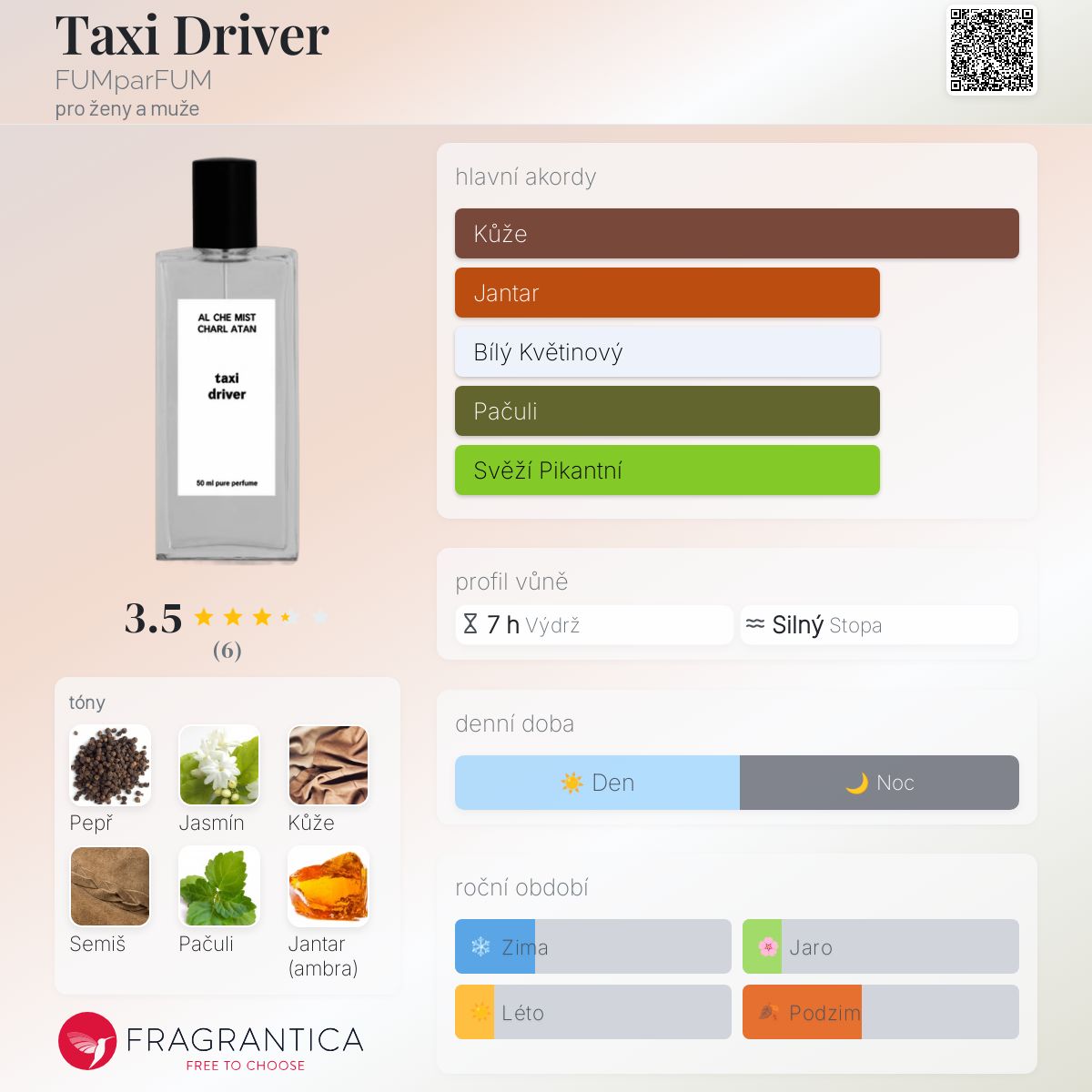 Taxi Driver podle FUMparFUM je vůně pro ženy a muže. Taxi Driver byl/a uveden/a v roce 2020. "Nosem" za touto vůní je Aistis Mickevičius. Vrchní tóny jsou Bílý pepř a Černý pepř; střední tón jeJasmín ; základní tóny jsou Kůže, Semiš, Pačuli a Jantar (ambra).