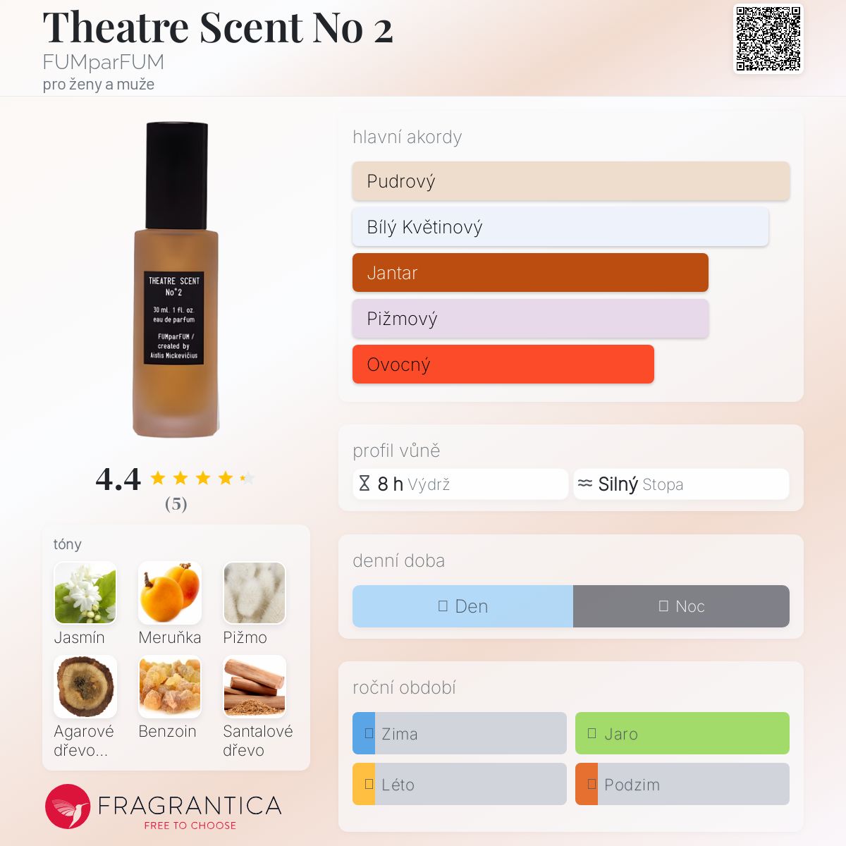 Theatre Scent No 2 podle FUMparFUM je Floral Woody Musk vůně pro ženy a muže. Theatre Scent No 2 byl/a uveden/a v roce 2014. "Nosem" za touto vůní je Aistis Mickevičius. Vrchní tón je Meruňka ; střední tóny jsouJasmín a Santalové dřevo ; základní tóny jsou Pižmo, Agarové dřevo (oud), Benzoin, Kosatec a Jantar (ambra).