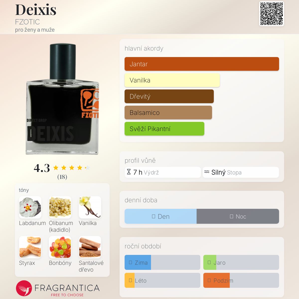 Deixis podle FZOTIC je Orientální Vanilla vůně pro ženy a muže. Toto je nová vůně. Deixis byl/a uveden/a v roce 2025. "Nosem" za touto vůní je Bruno Fazzolari. Vrchní tón je Sladké tóny ; střední tóny jsouLabdanum, Vanilka a Santalové dřevo ; základní tóny jsou Kadidlo a Styrax.